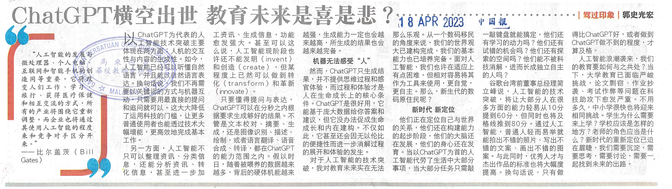 郭史光宏:ChatGPT横空出世 教育未来是喜是悲? WhatsApp 上一篇文章: 当选2023年剑桥教师区域优胜者 吴国明教育贡献获国际肯定 上一页 下一篇文章: ChatGPT对学校是好是坏? 下一页