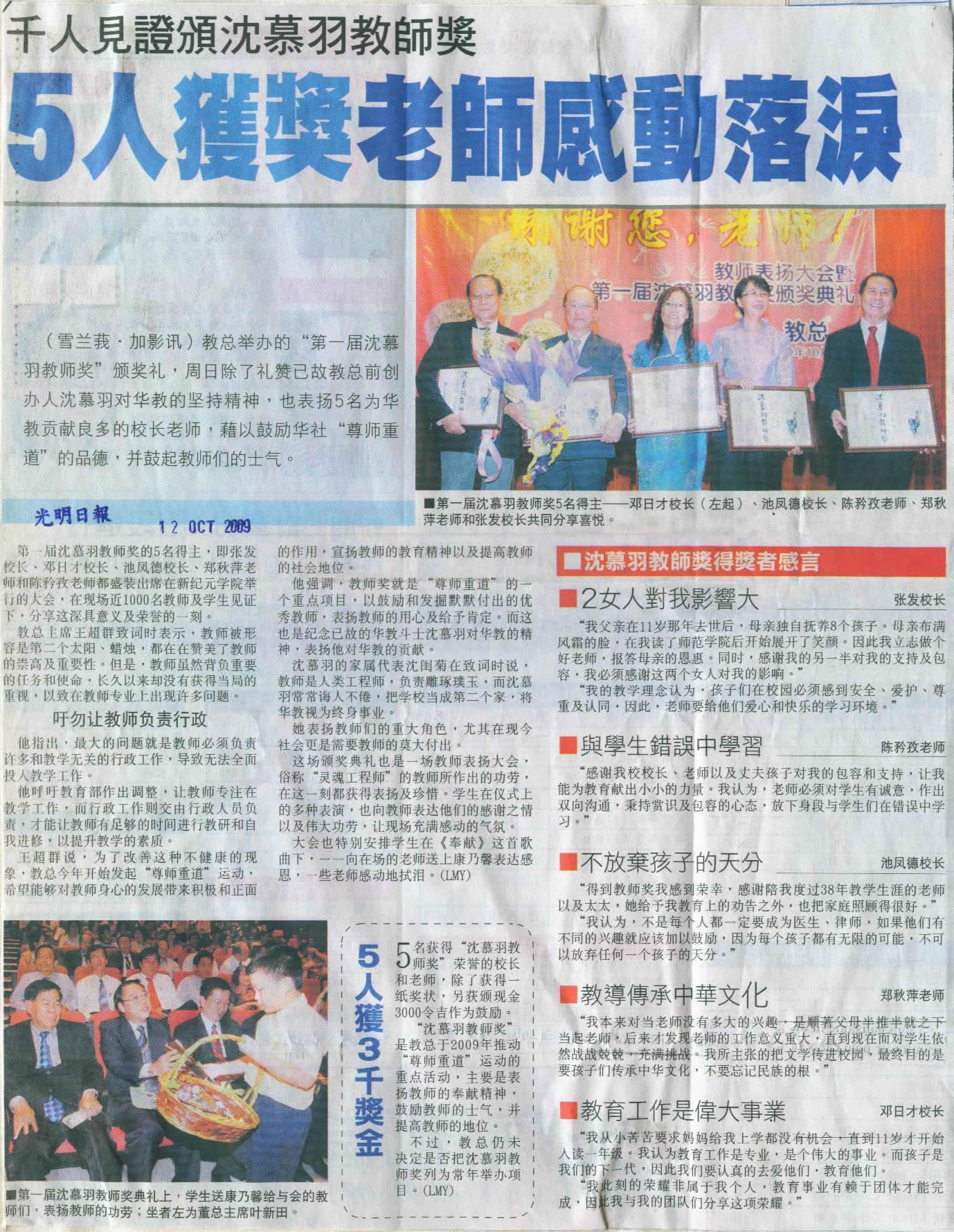 千人见证颁沈慕羽教师奖(光明日报) 千人见证颁沈慕羽教师奖(光明日报 10月12日) 下载:点击 资料来源:教总调查研究及资讯组整理 WhatsApp 上一篇文章: 让教师回归教学专业(星洲日报) 上一页 下一篇文章: 5人获颁沈慕羽奖(东方日报) 下一页