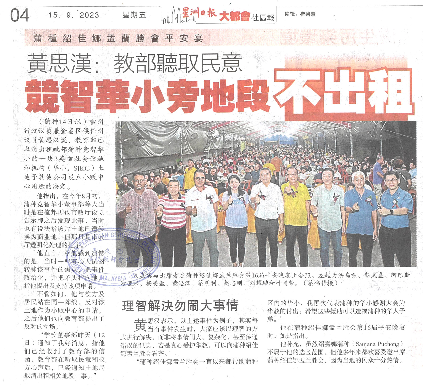 黄思汉:教育部听取民意 竞智华小旁地段不出租