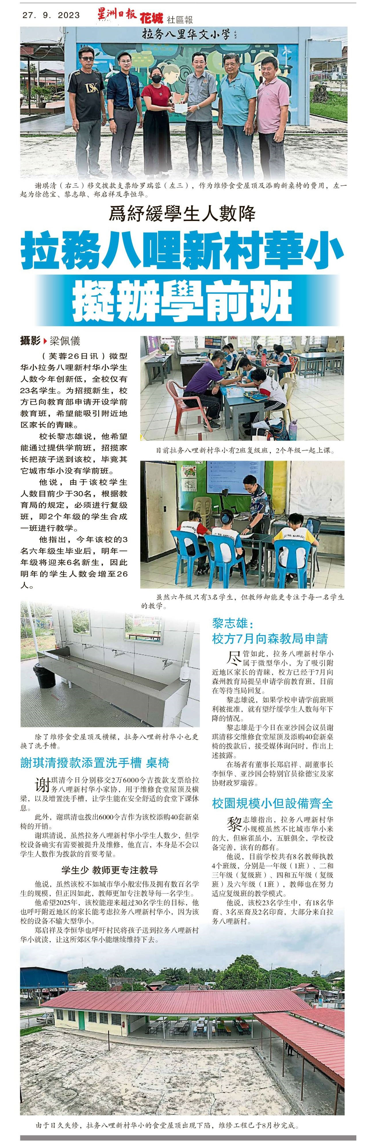 为舒缓学生人数降 拉务八哩新村华小拟办学前班 WhatsApp 上一篇文章: 砂华小董联会备忘录呈教育部 吁教育部权力下放砂教育局 上一页 下一篇文章: 董教总:确保公平对待各校 盼财案详列教育拨款 下一页