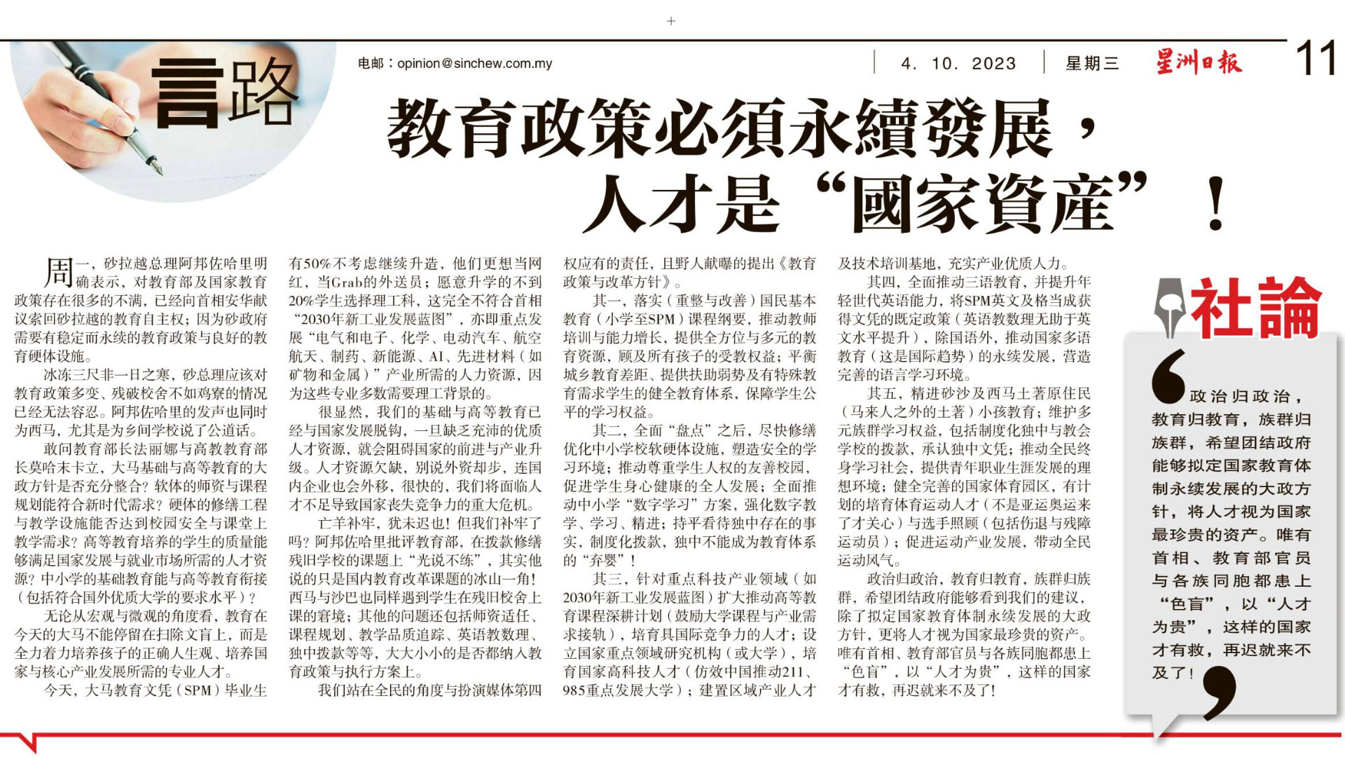 教育政策必须永续发展 人才是“国家资产”
