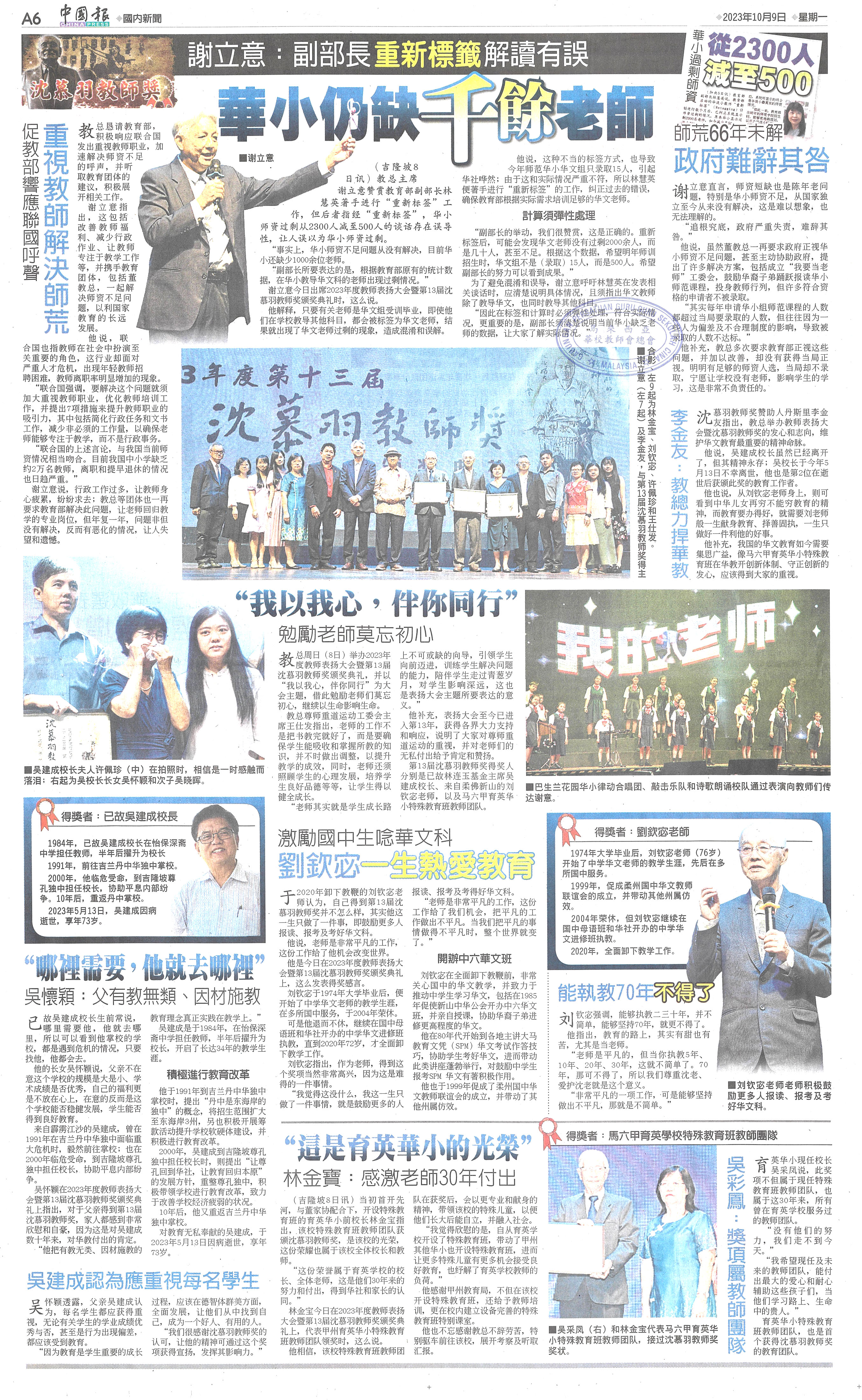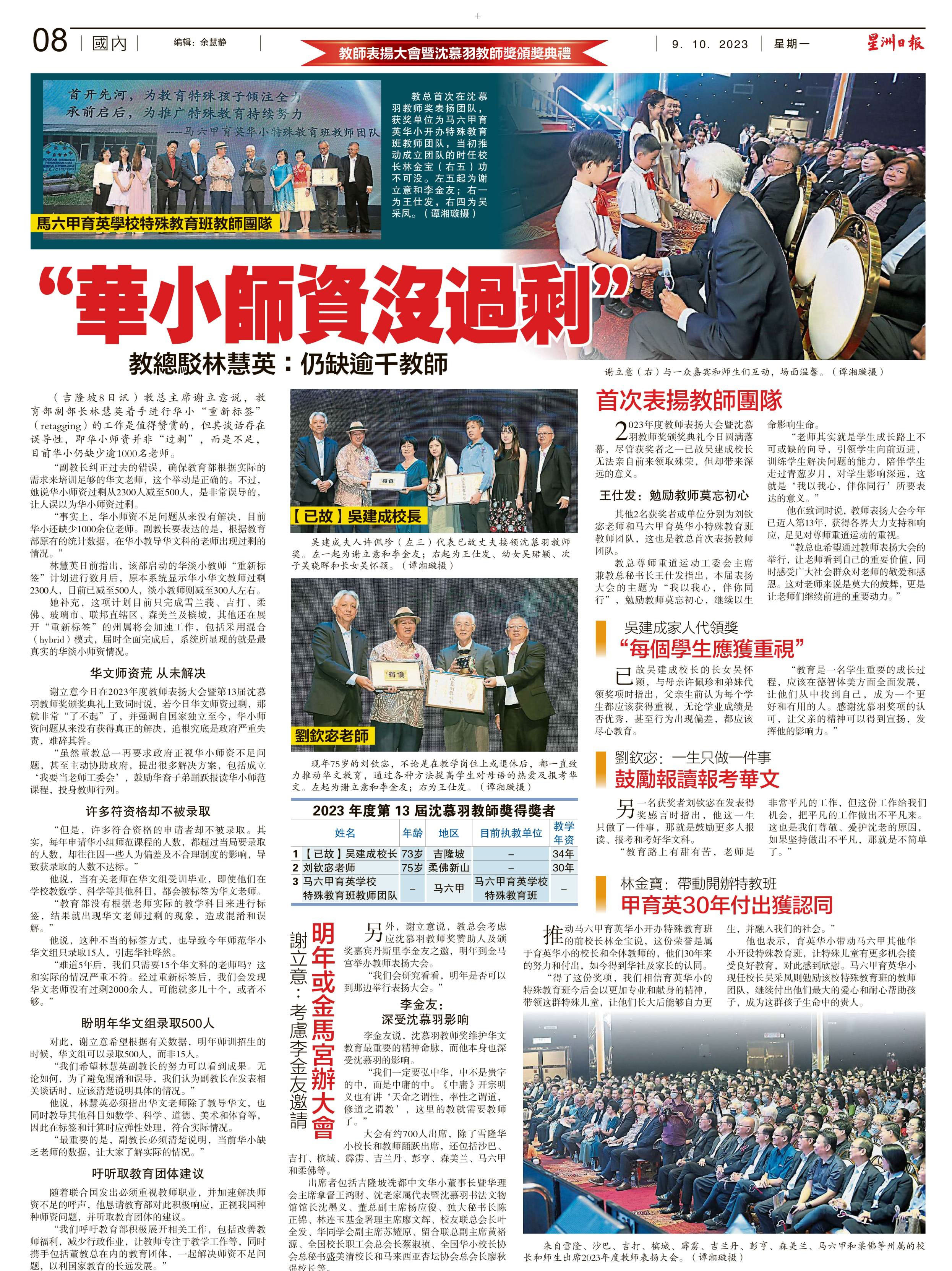 2023教师表扬大会暨沈慕羽教师奖颁奖典礼 WhatsApp 上一篇文章: 一年级新生申请结果出炉 30日前须登入idMe确认 上一页 下一篇文章: 教育部:解决师资短缺,下月录取9500新教师 下一页