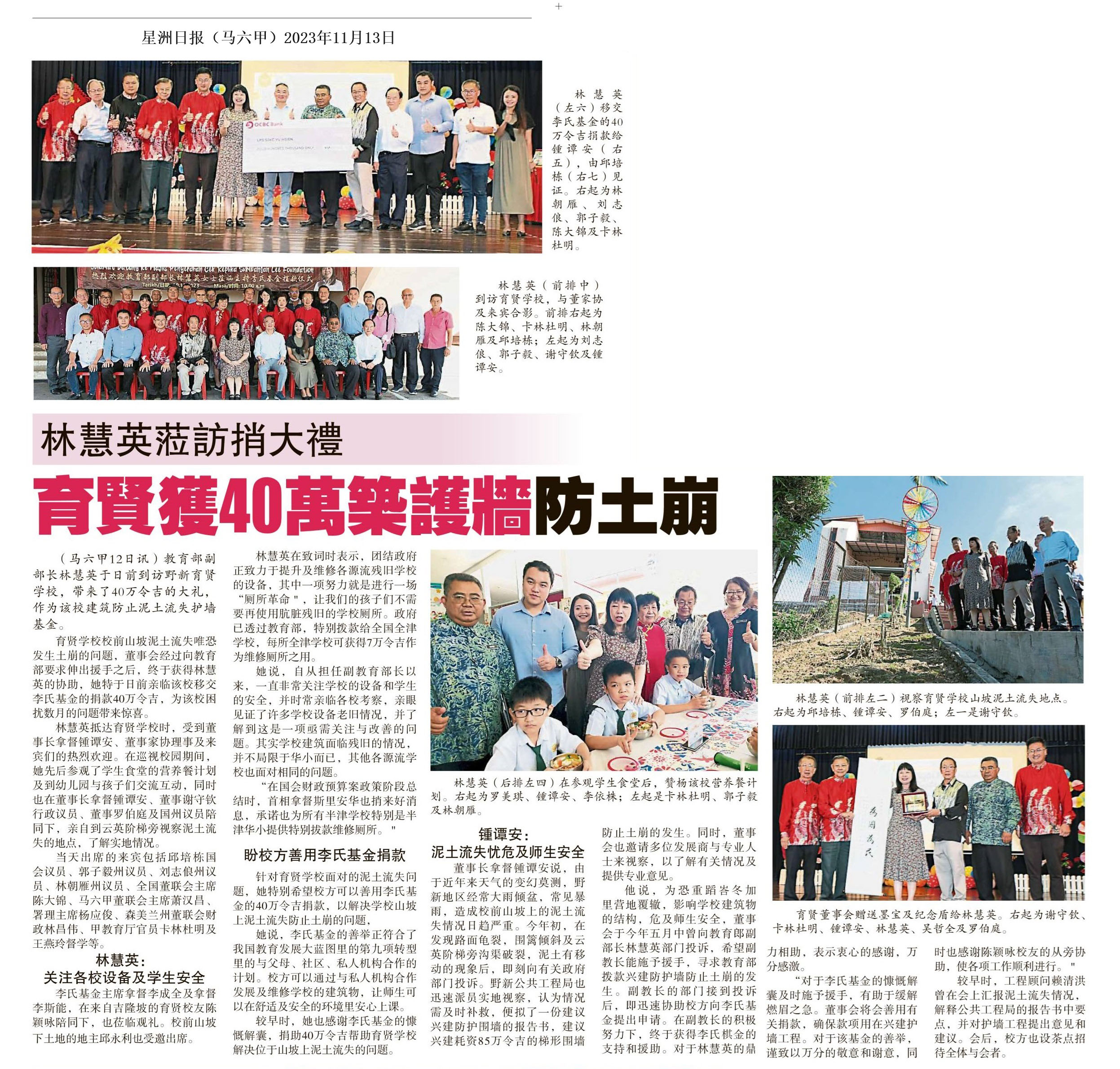 林慧英莅访捎大礼 育贤获40万筑护墙防土崩 WhatsApp 上一篇文章: 晋汉连华小33空缺待补 董联会近晤教育局长 上一页 下一篇文章: 林慧英:5.6亿仅首阶分配建议 尽量提高学校维修拨款 下一页