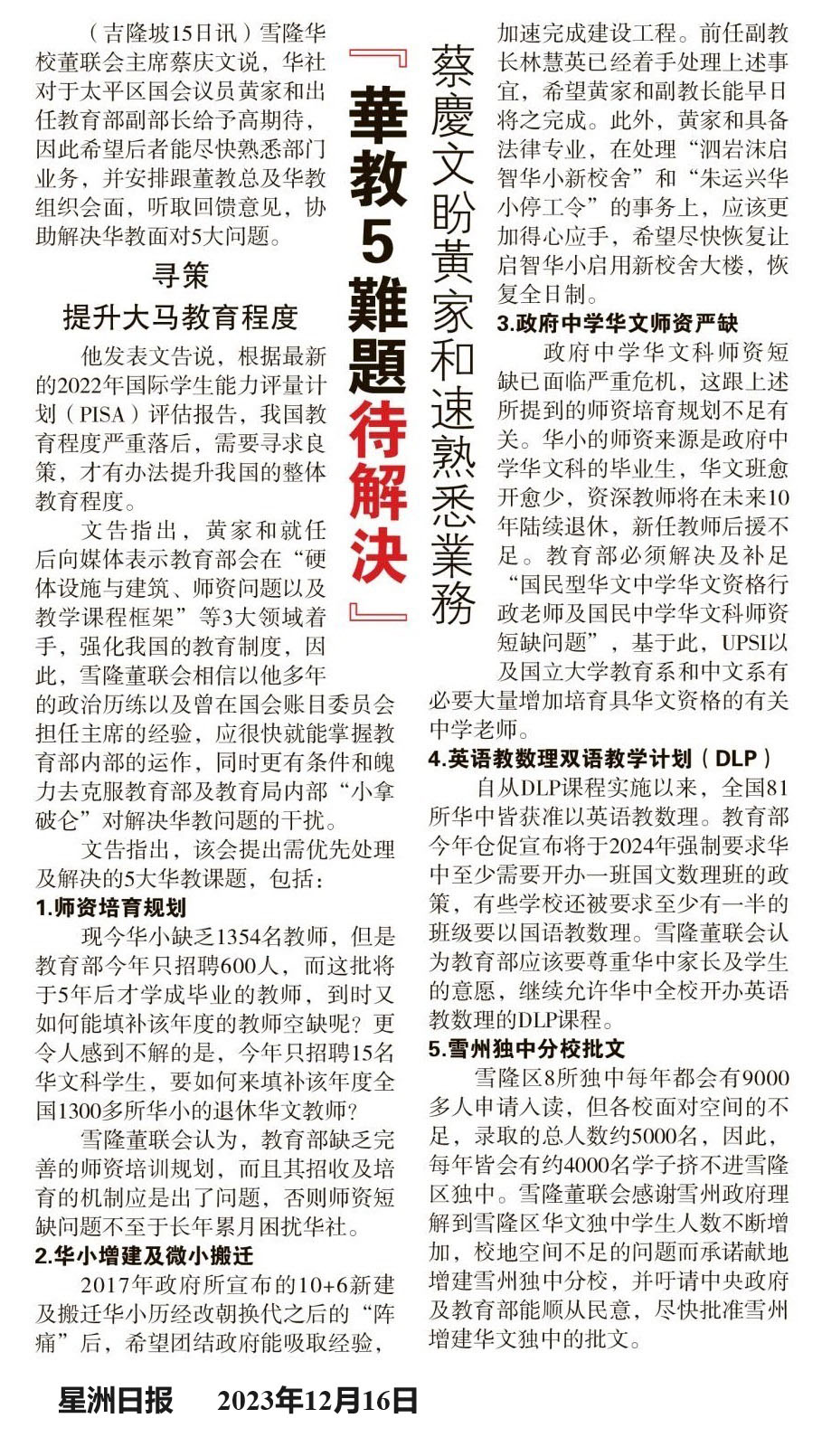 蔡庆文盼黄家和速熟悉业务  华教5难题待解决