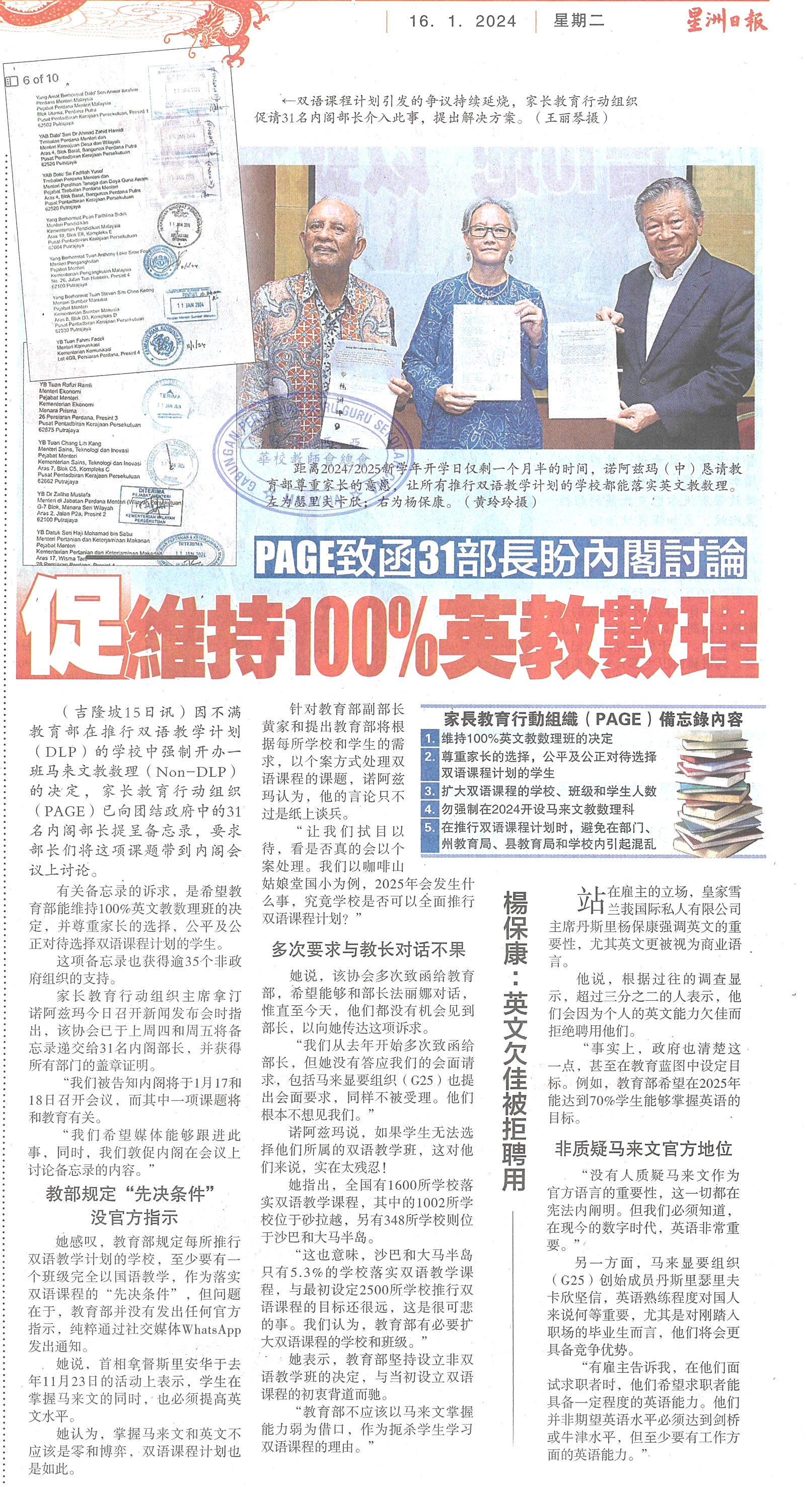 PAGE 致函31部长盼内阁讨论 促维持100%英教数理