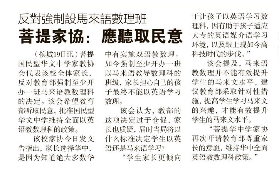 反对强制设马来语数理班 菩提家协:应听取民意