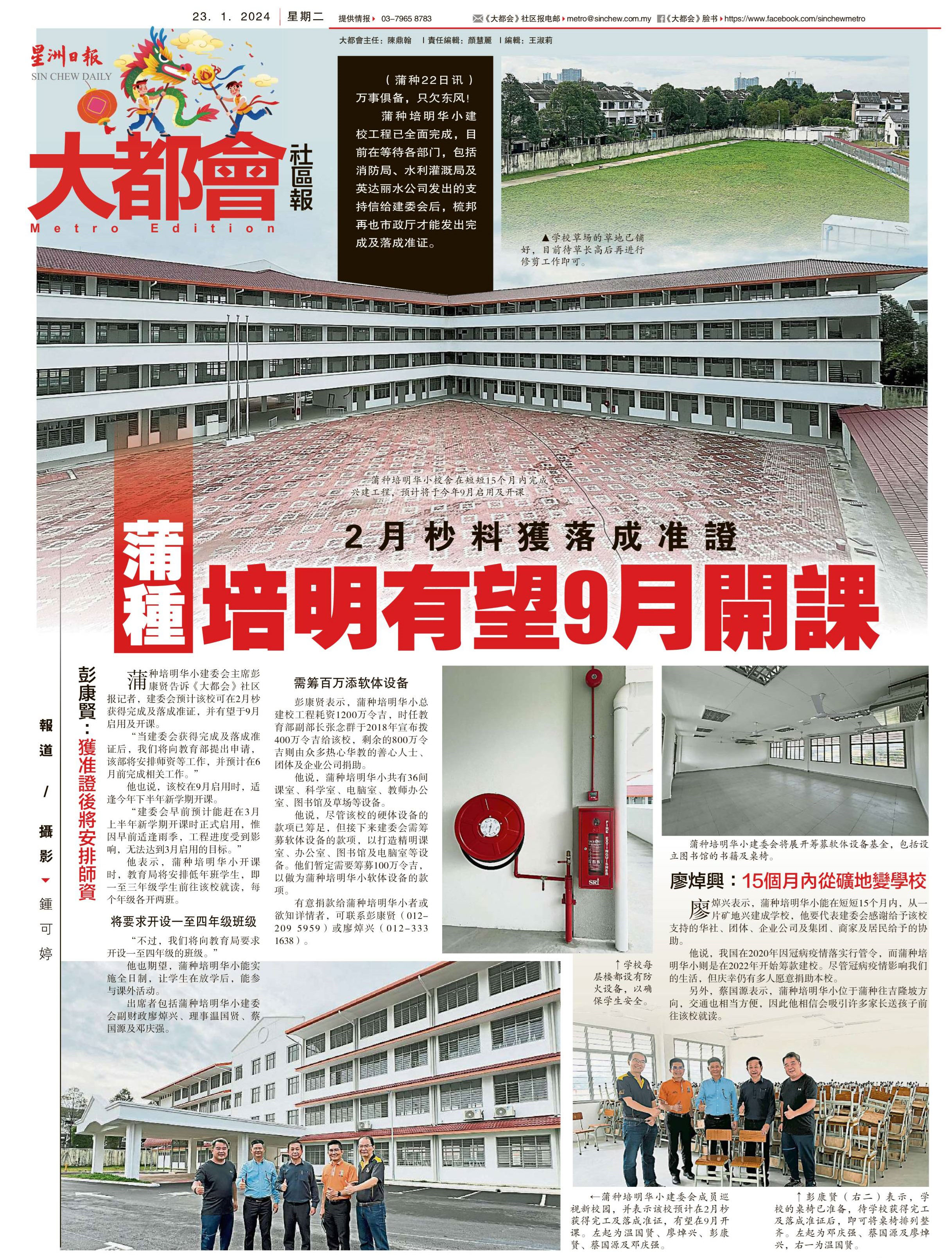 2月杪料获落成准证 蒲种培明有望9月开课 WhatsApp 上一篇文章: 首相署特别拨款 光育华小喜获100万 上一页 下一篇文章: 黄振江创作 启二727人合唱《启动今天.明日辉煌》满满正能量 下一页