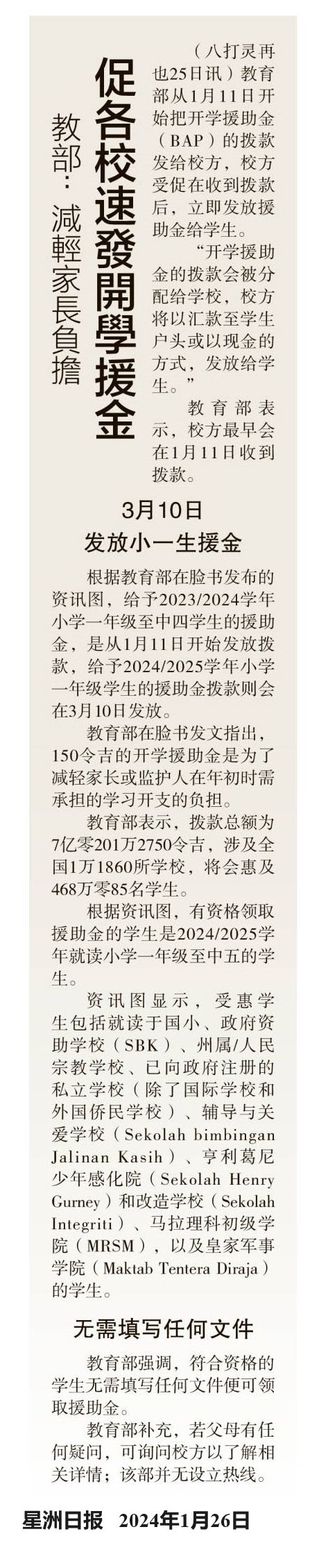 教育部:减轻家长负担 促各校速发开学援助金