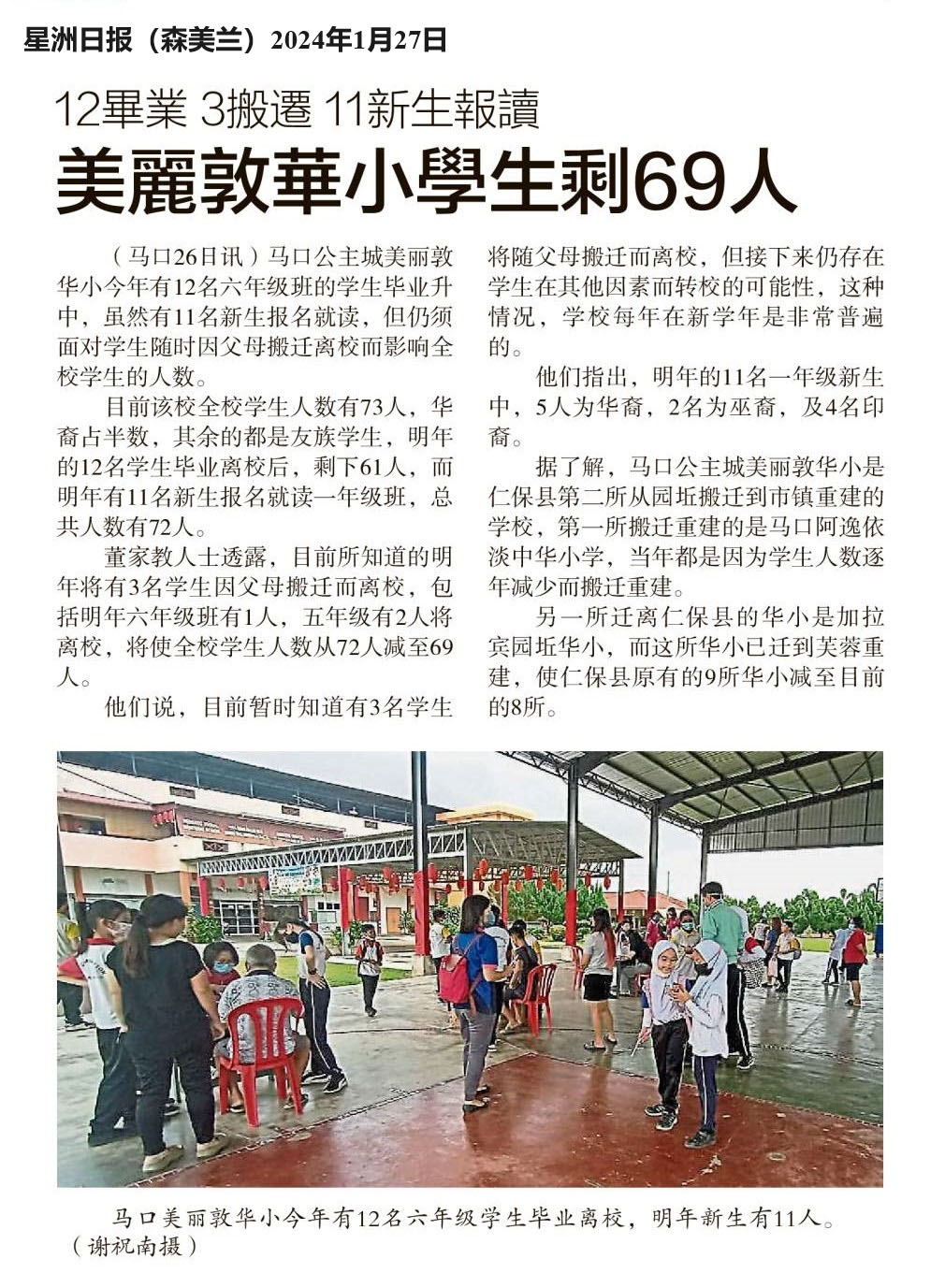 12毕业 3搬迁 11新生报读 美丽敦华小学生剩69人 WhatsApp 上一篇文章: 教育部长:冠病大流行期间 停课影响国际学生评估 上一页 下一篇文章: 巫裔爸妈送4儿读华校(华校教育受巫裔家长的喜爱) 下一页