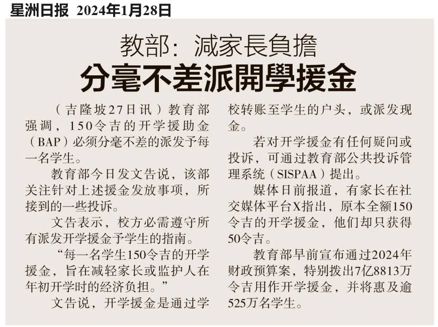 教育部:减家长负担 分毫不差派开学援金