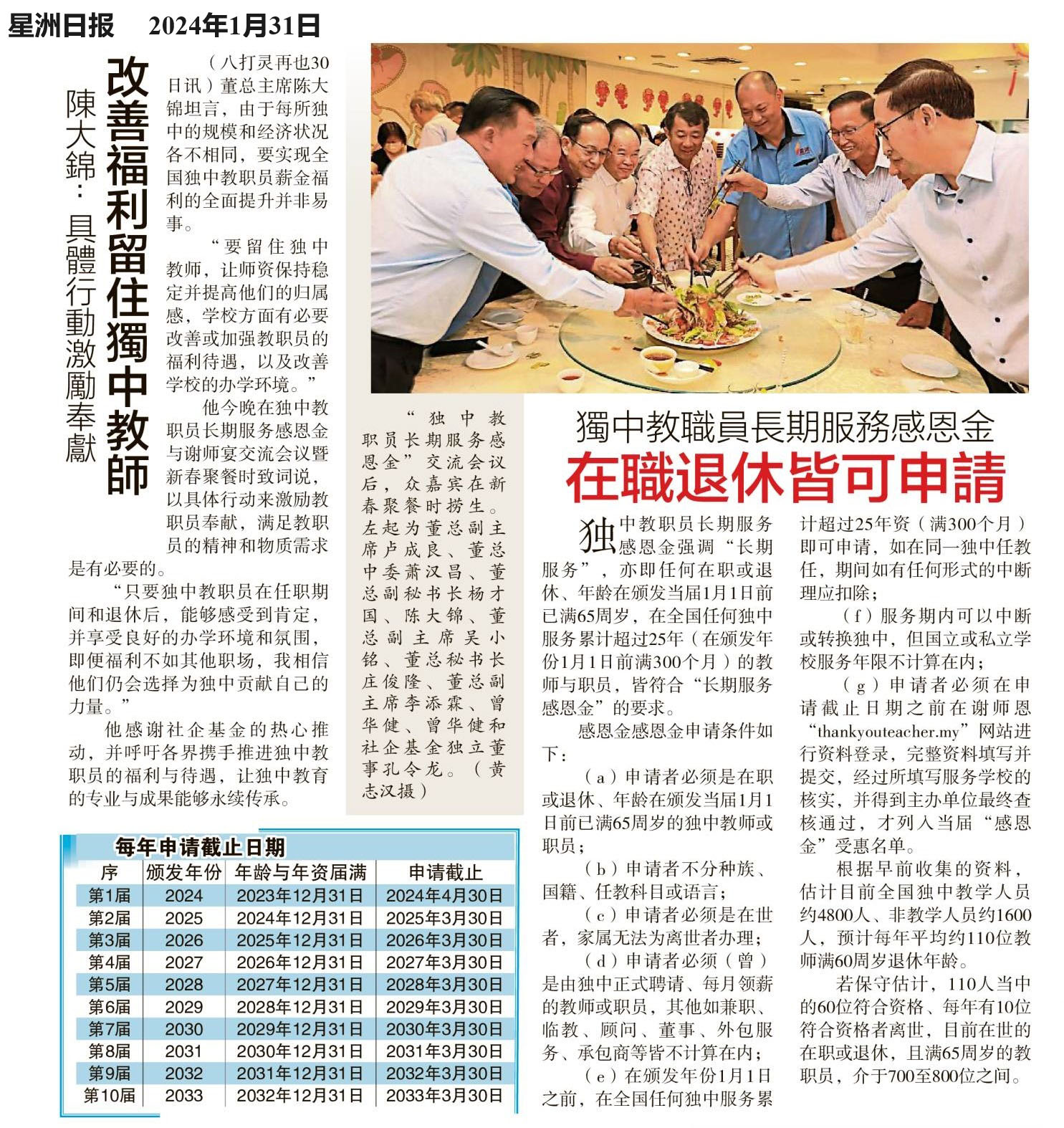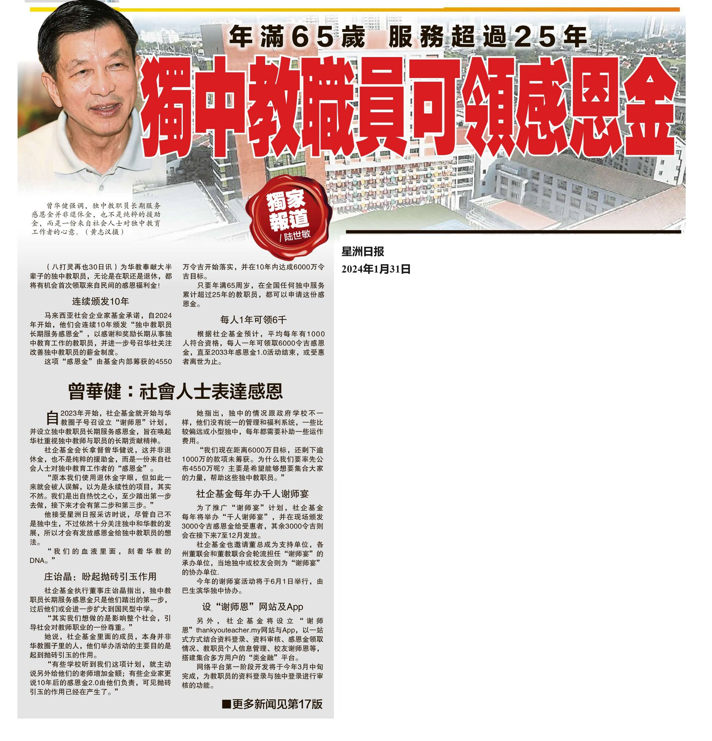 年满65岁 服务超过25年 独中教职员可领感恩金