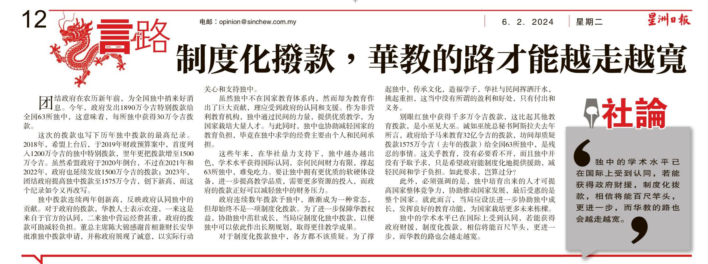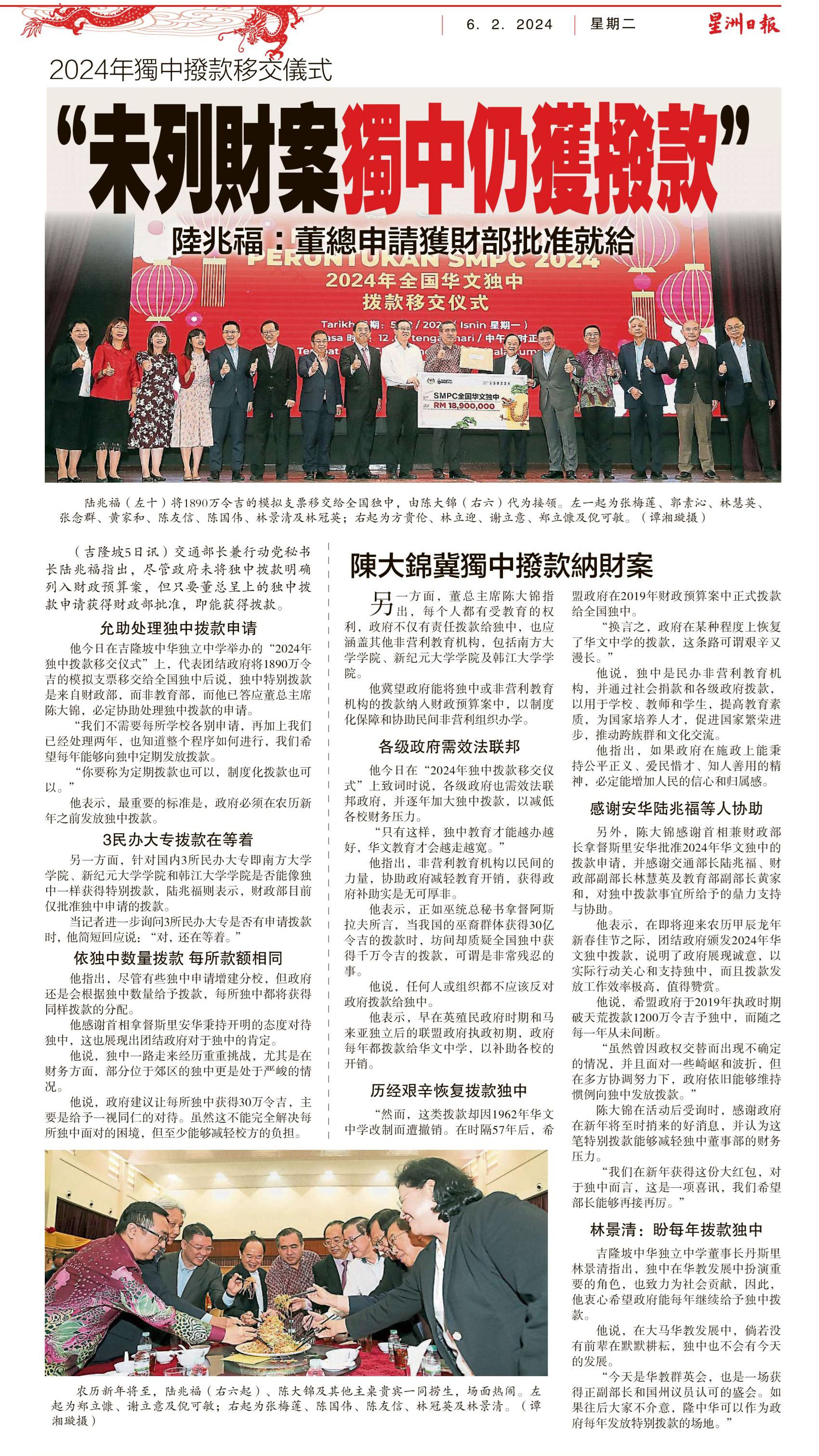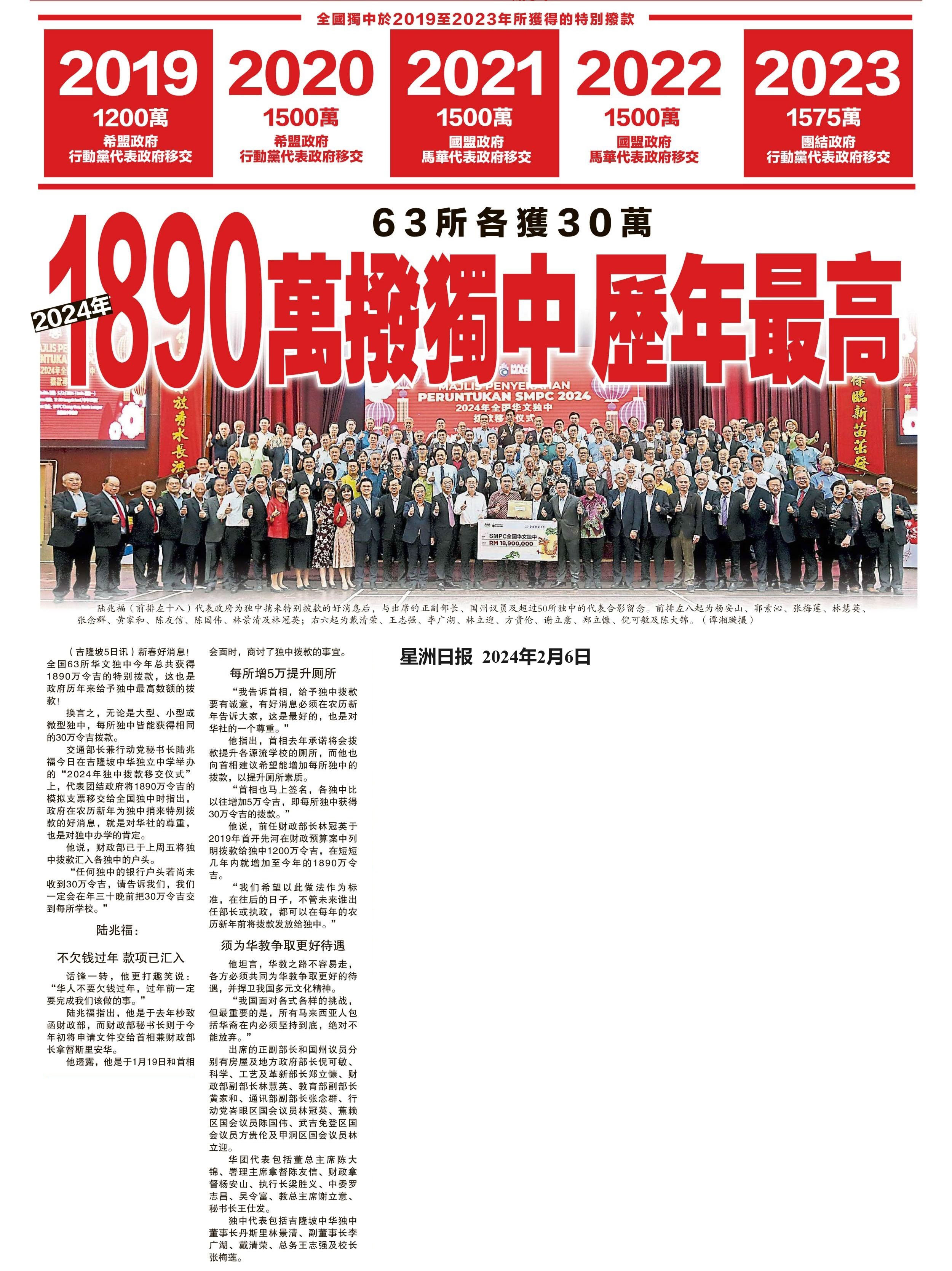 63所各获30万 1890万拨独中 历年最高