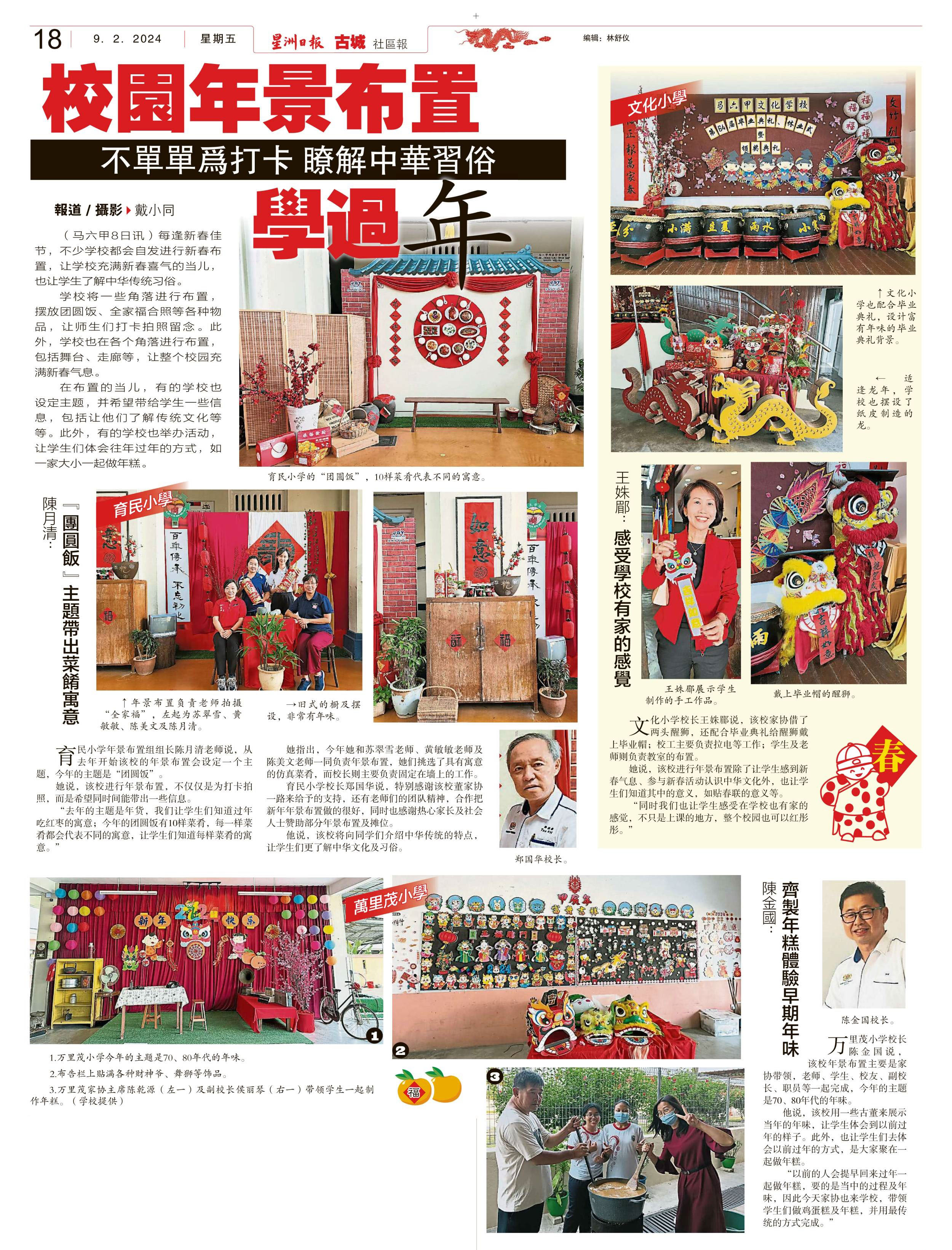校园年景布置 不单单为打卡 了解中华习俗 学过年 WhatsApp 上一篇文章: 黄家和:华小课题 任内使命 “建校迁校重中之重” 上一页 下一篇文章: 历经20年 新港校舍启用 益华小学3月开课 下一页