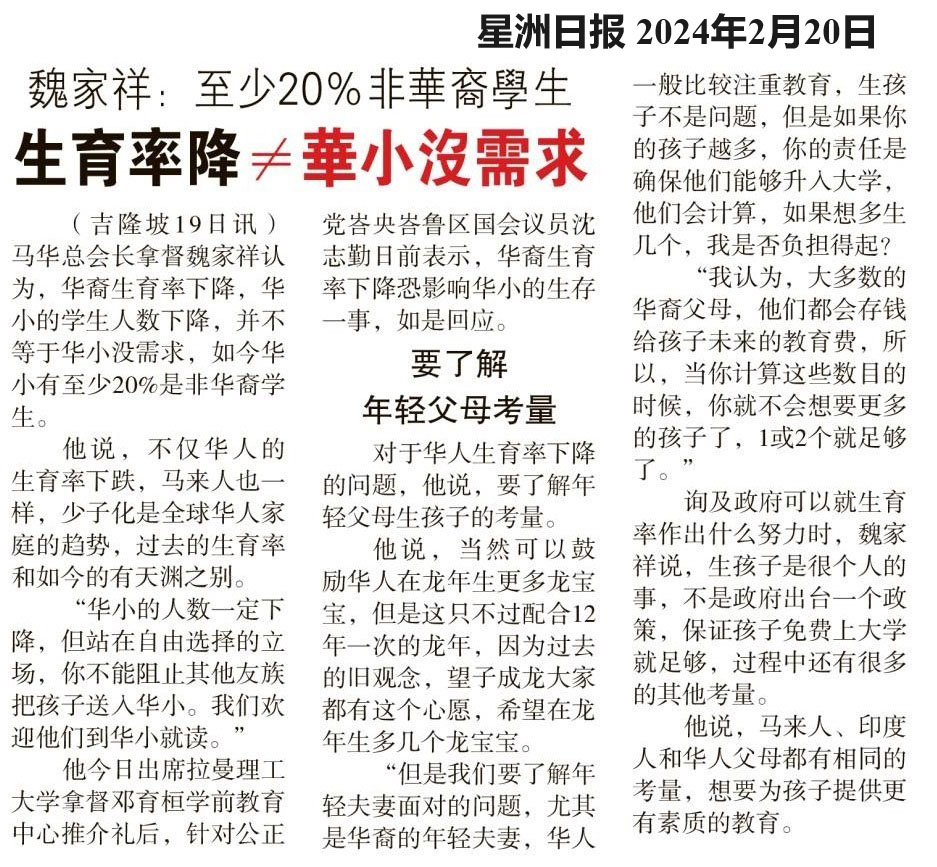 魏家祥:至少20%非华裔学生 生育率降≠华小没需求
