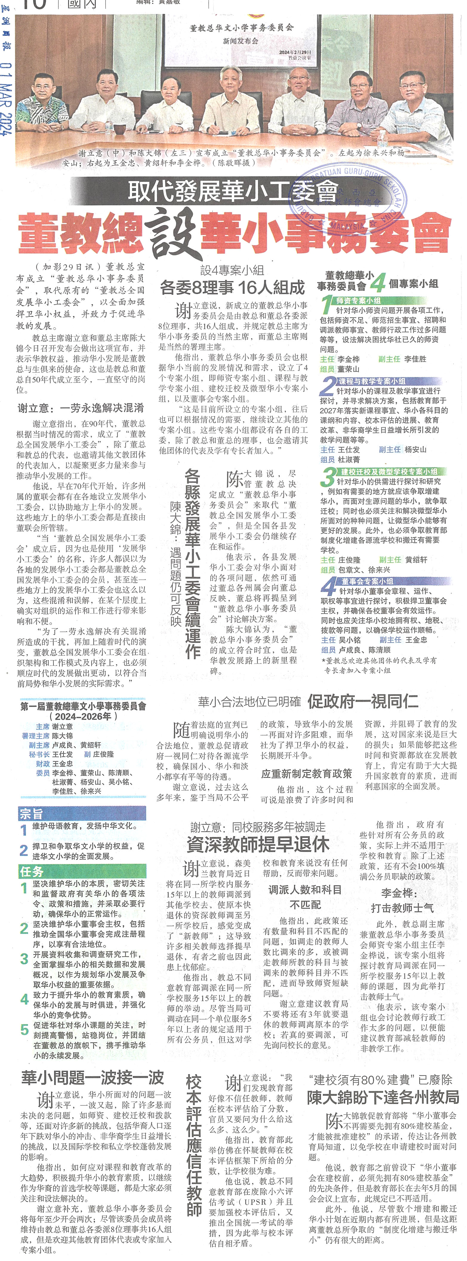 取代发展华小工委会 董教总设华小事务委会