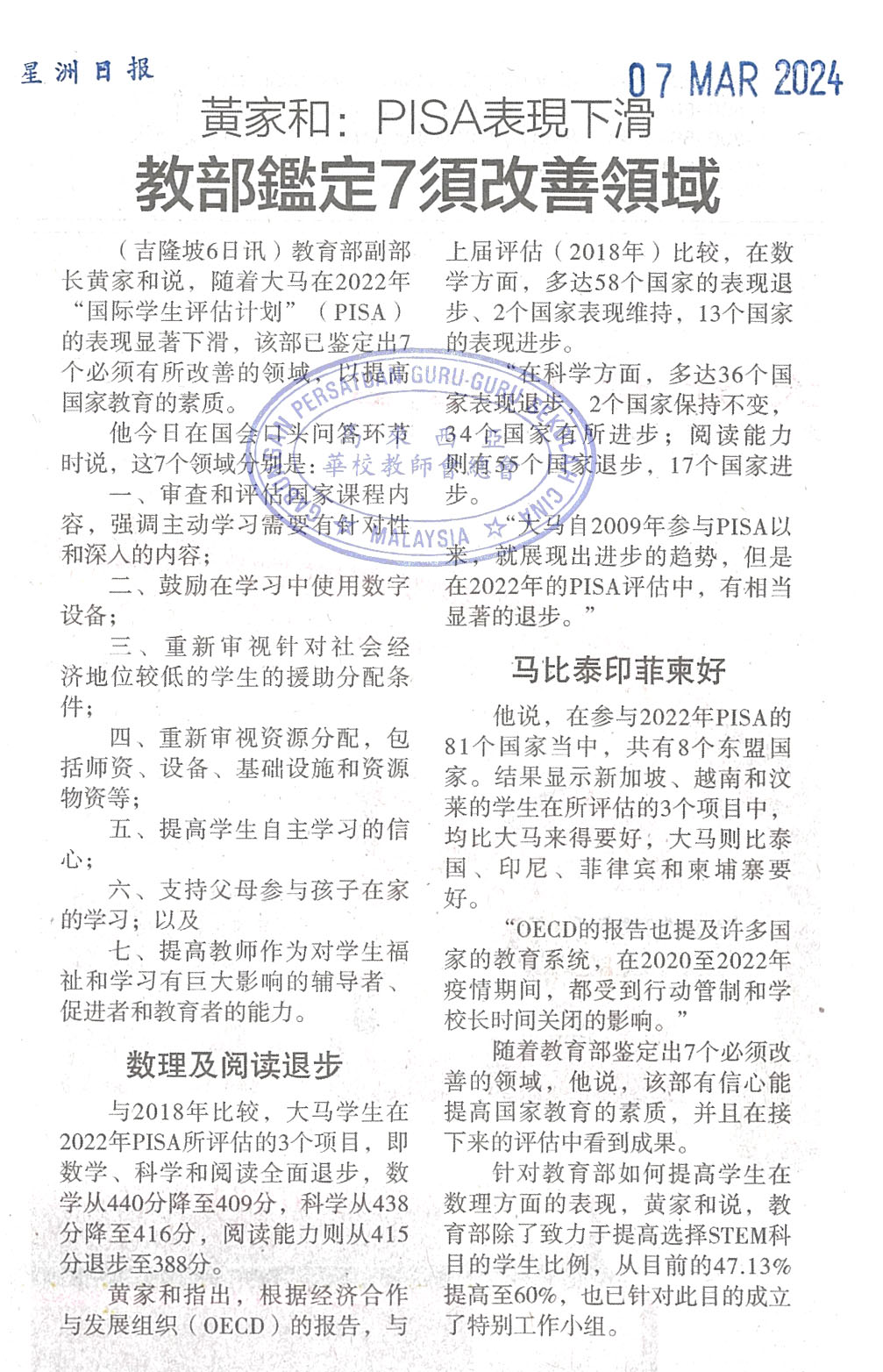 黄家和:PISA表现下滑 教部鉴定7须改善领域