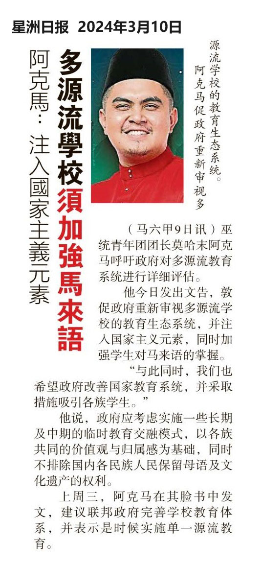 阿克马:注入国家主义元素 多源流学校须加强马来语