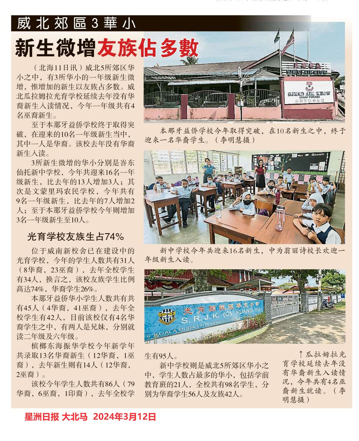 槟城威北郊区3华小 新生微增友族占多数