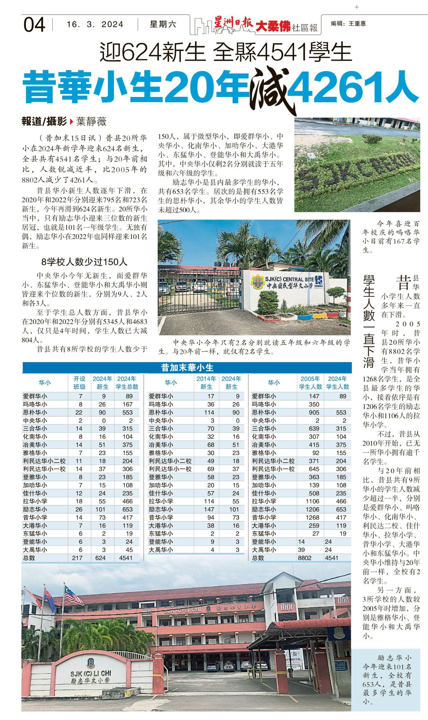 迎624新生 全县4541学生 昔华小生20年减4261人 WhatsApp 上一篇文章: 知知西廊民生小学增至20人 吉辇微小新生回暖 上一页 下一篇文章: 土著54华裔38 西连中公迎92新生 下一页