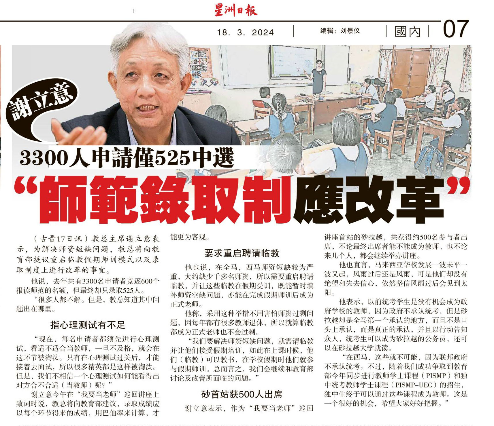 谢立意:3300人申请仅525中选 “师范录取制应改革” WhatsApp 上一篇文章: 蔡傌友:避免出现断层 津贴华中聘华文临教 上一页 下一篇文章: 新校舍未能启用或明年搬迁 呀吃18哩中华华小原校上课 下一页