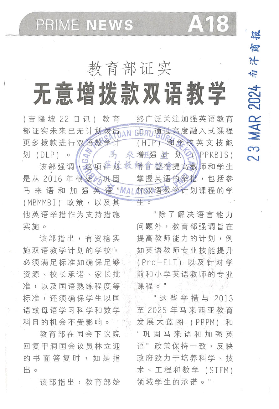教育部证实无意增拨款双语教学