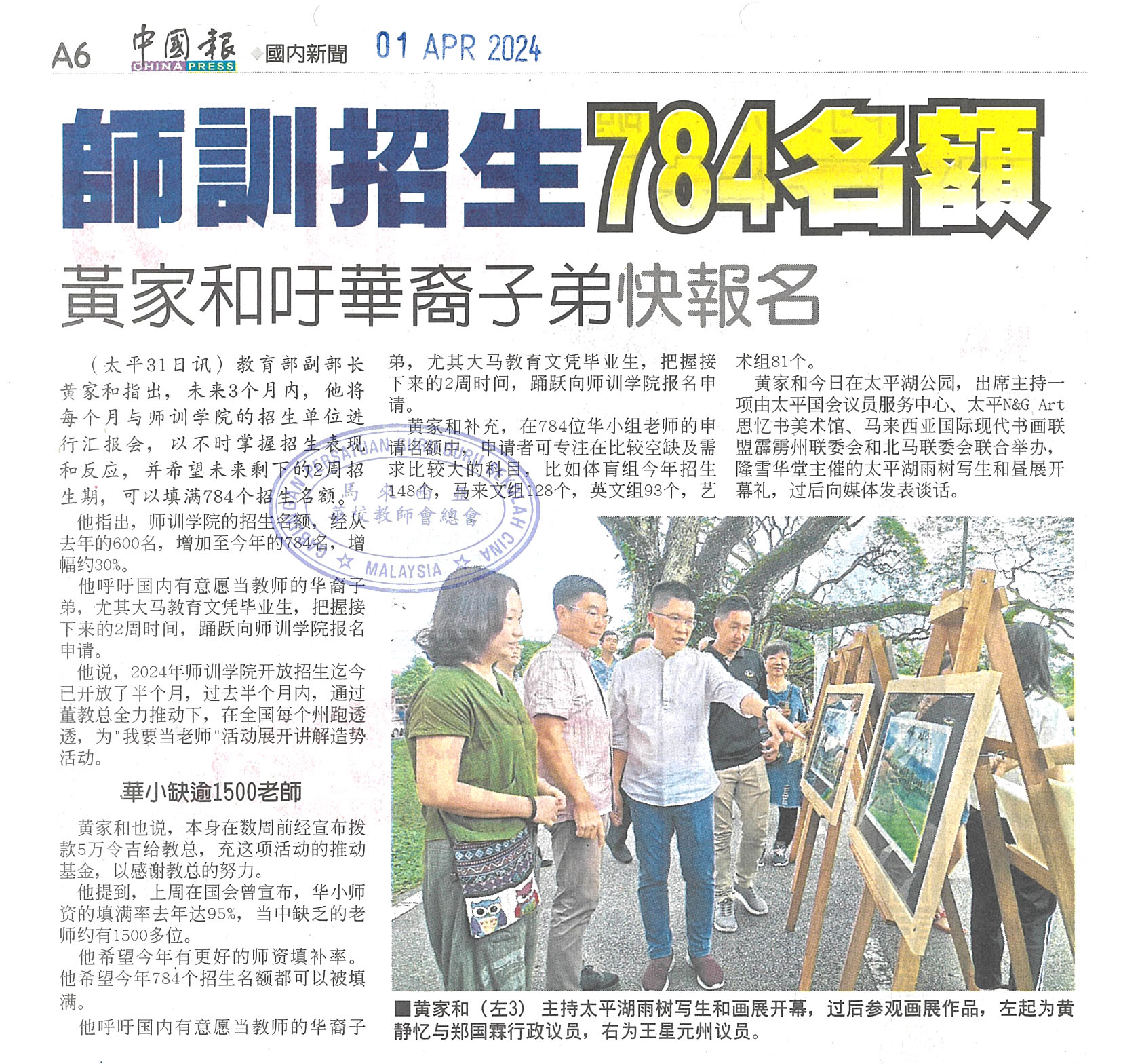 师训招生784名额 黄家和吁华裔子弟快报名