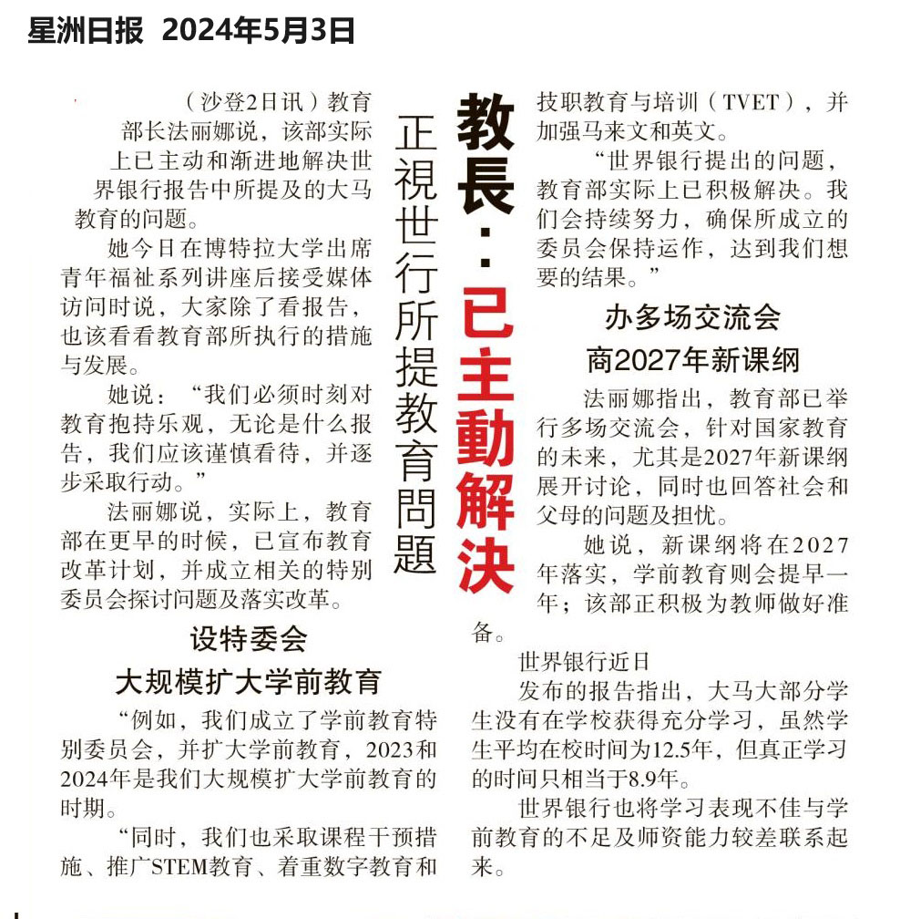 正视世行所提教育问题  教长:已主动解决