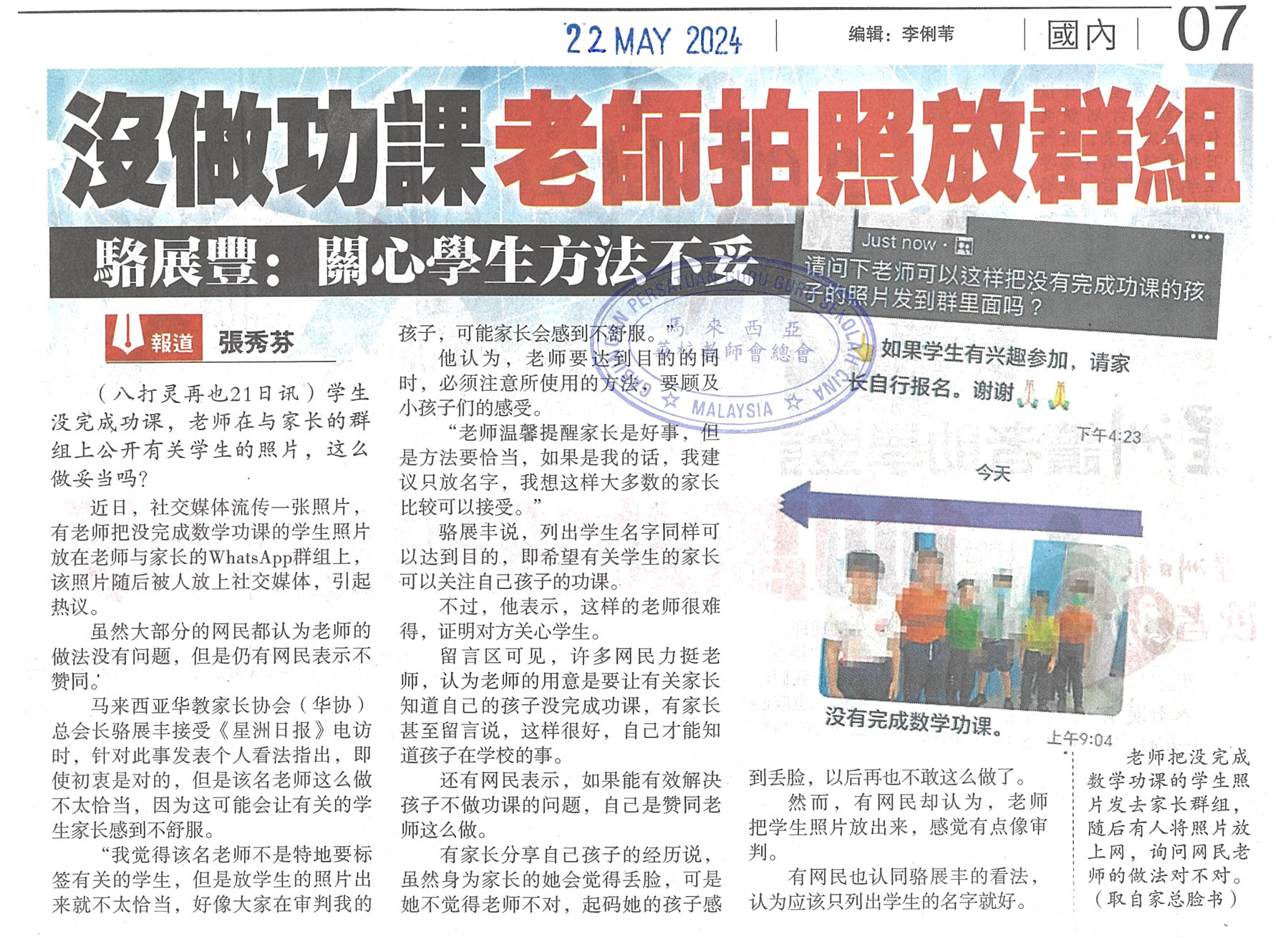 没做功课老师拍照放群组 骆展丰:关心学生的方法不妥 WhatsApp 上一篇文章: 黄家和:鼓励向教部申请开班 今年93校设279特教班 上一页 下一篇文章: 校外拉“遭诽谤受害者”横幅 培英华小家长声援校长 下一页