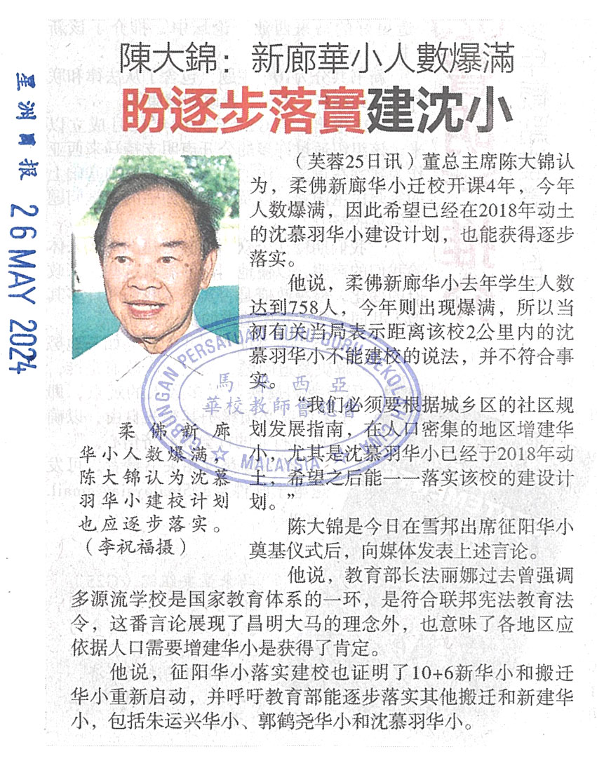 陈大锦:新廊华小人数爆满 盼逐步落实建沈小