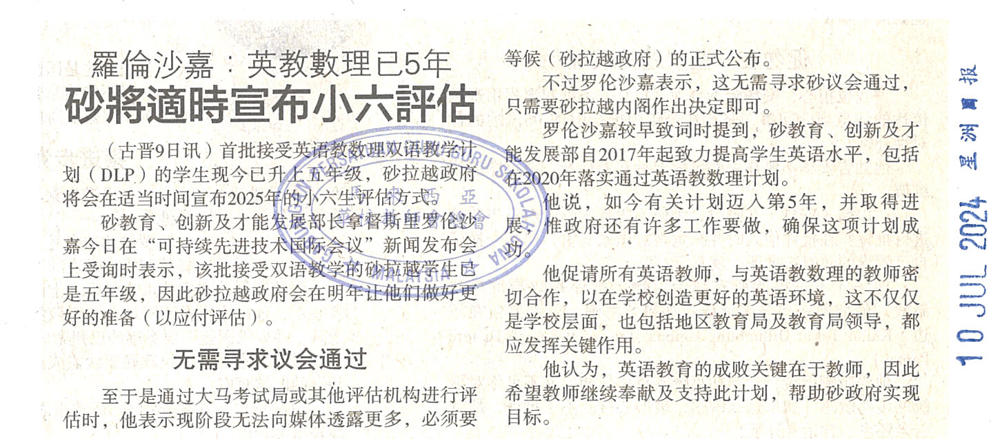 罗伦沙嘉:英数理已5年 砂将适时宣布小六评估