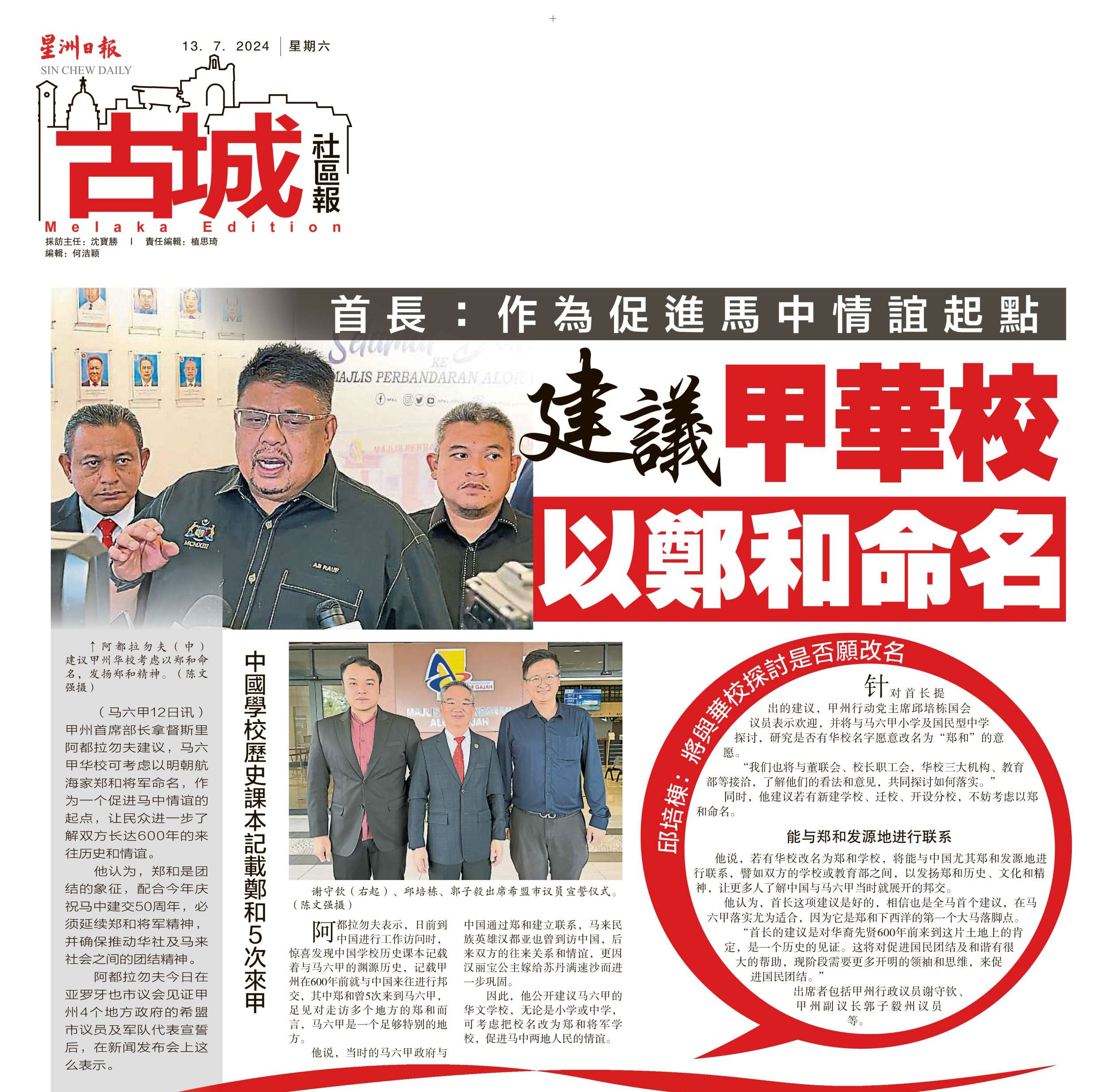 首长:作为促进马中情谊起点 建议甲华校以郑和命名 WhatsApp 上一篇文章: 育民华小 193学生 华裔仅65人 成“变相国小” 上一页 下一篇文章: 优化教育部综合系统 免课外活动评估零分重演 下一页