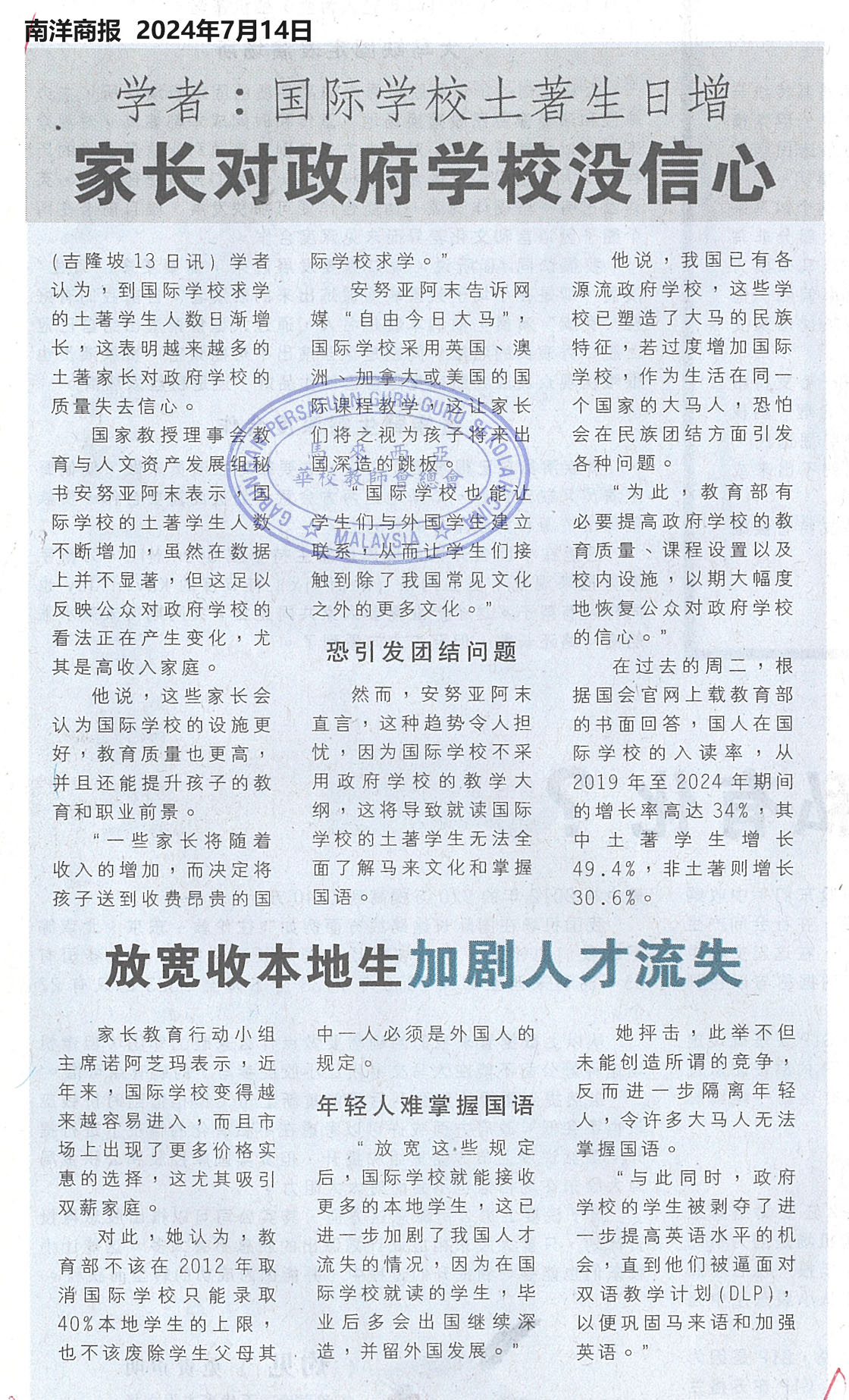 学者:国际学校土著生日增 家长对政府学校没信心