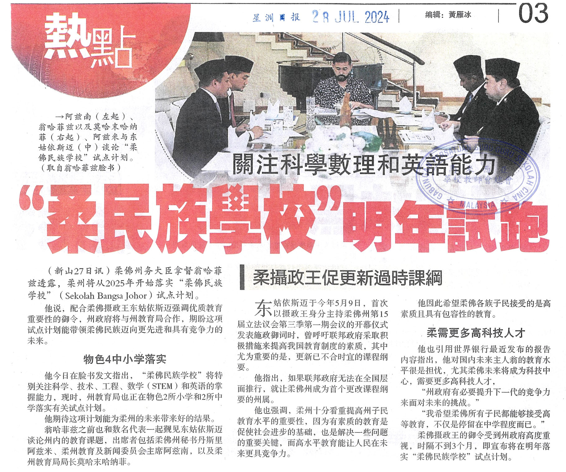 柔民族学校明年试跑 关注科学数理和英语能力 WhatsApp 上一篇文章: 启智华小土地权风波:董事部拒将课题例入议程 知情者抨“绑架骑劫启智” 上一页 下一篇文章: 禁学校收烟酒赌业捐款课题剪报 下一页