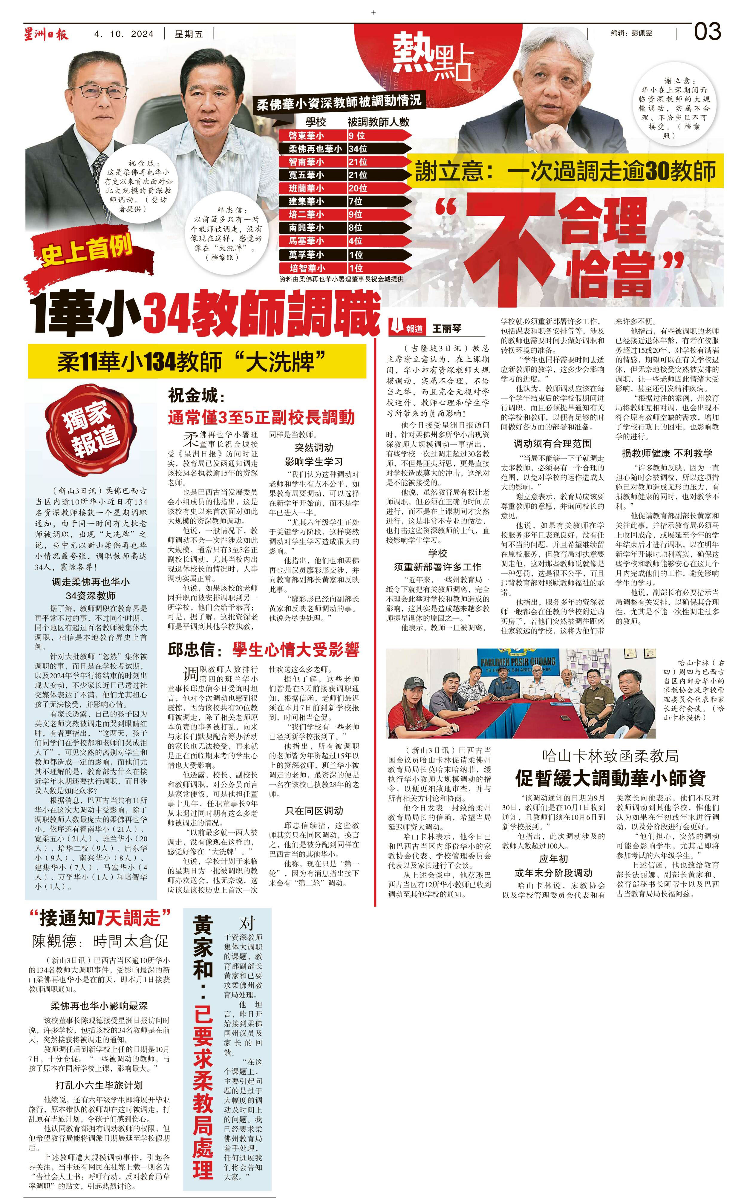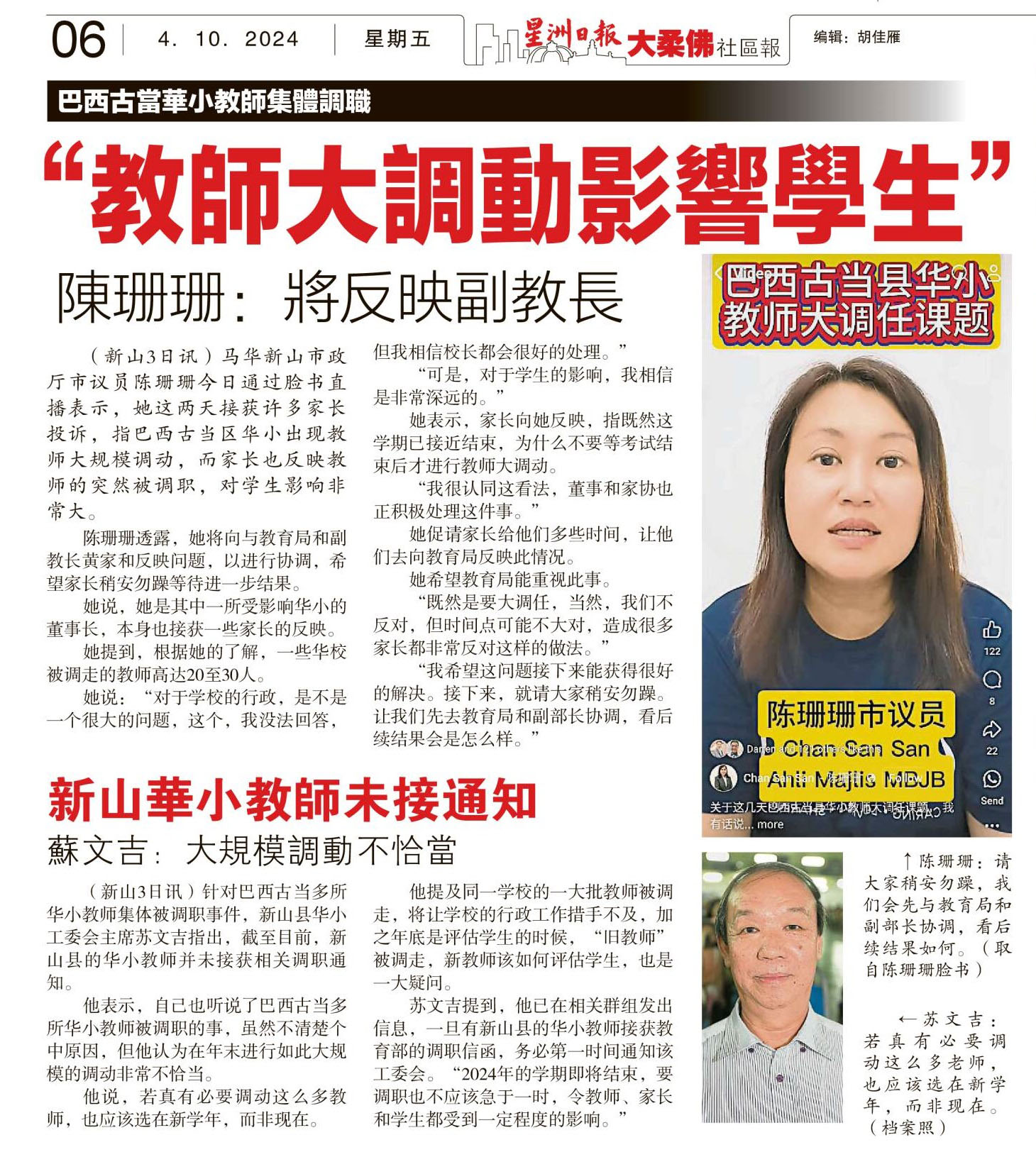 史上首例 1华小34教师调职 柔11华小134教师“大洗牌” WhatsApp 上一篇文章: 真光华育舞龙队华小生组成 小小身躯舞出新活力 上一页 下一篇文章: 教育基金会免税地位被撤 优大被追税罚款8300万 下一页