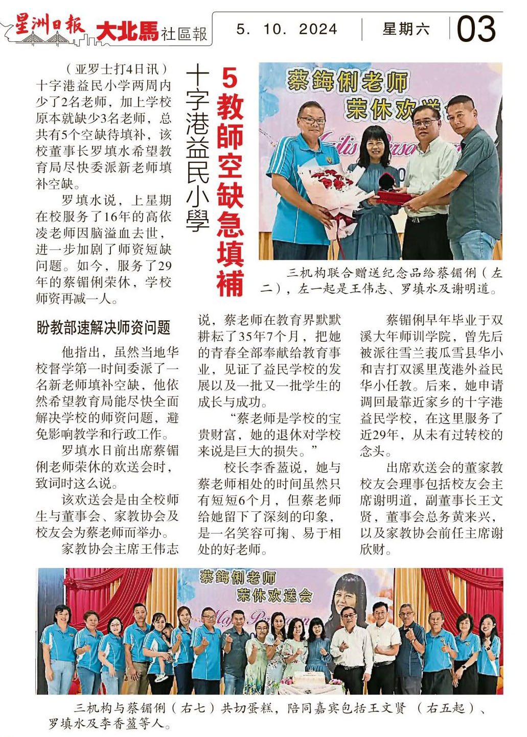 十字港益民小学 5教师空缺急填补