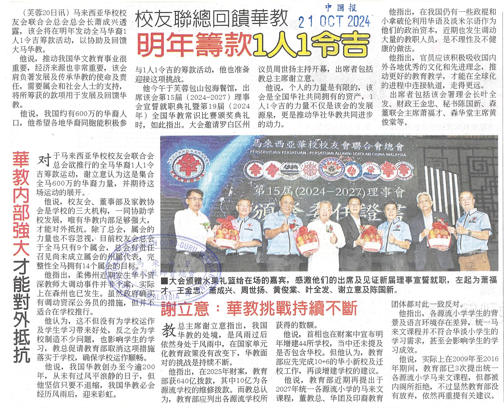 校友联总回馈华教 明年筹款1人1令吉