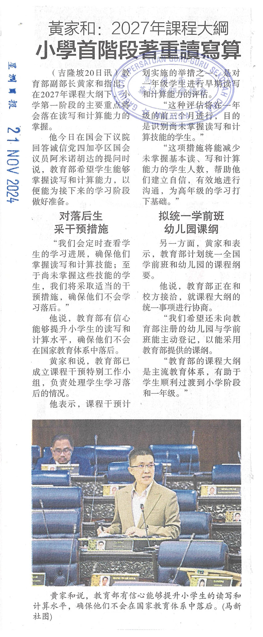 黄家和:2027年课程大纲 小学首阶段着重读写算 WhatsApp 上一篇文章: 柔拨款1200万给华印社群 南方大学学院获100万 上一页 下一篇文章: 教长:按趋势改进指南 授未成年生殖健康知识 下一页