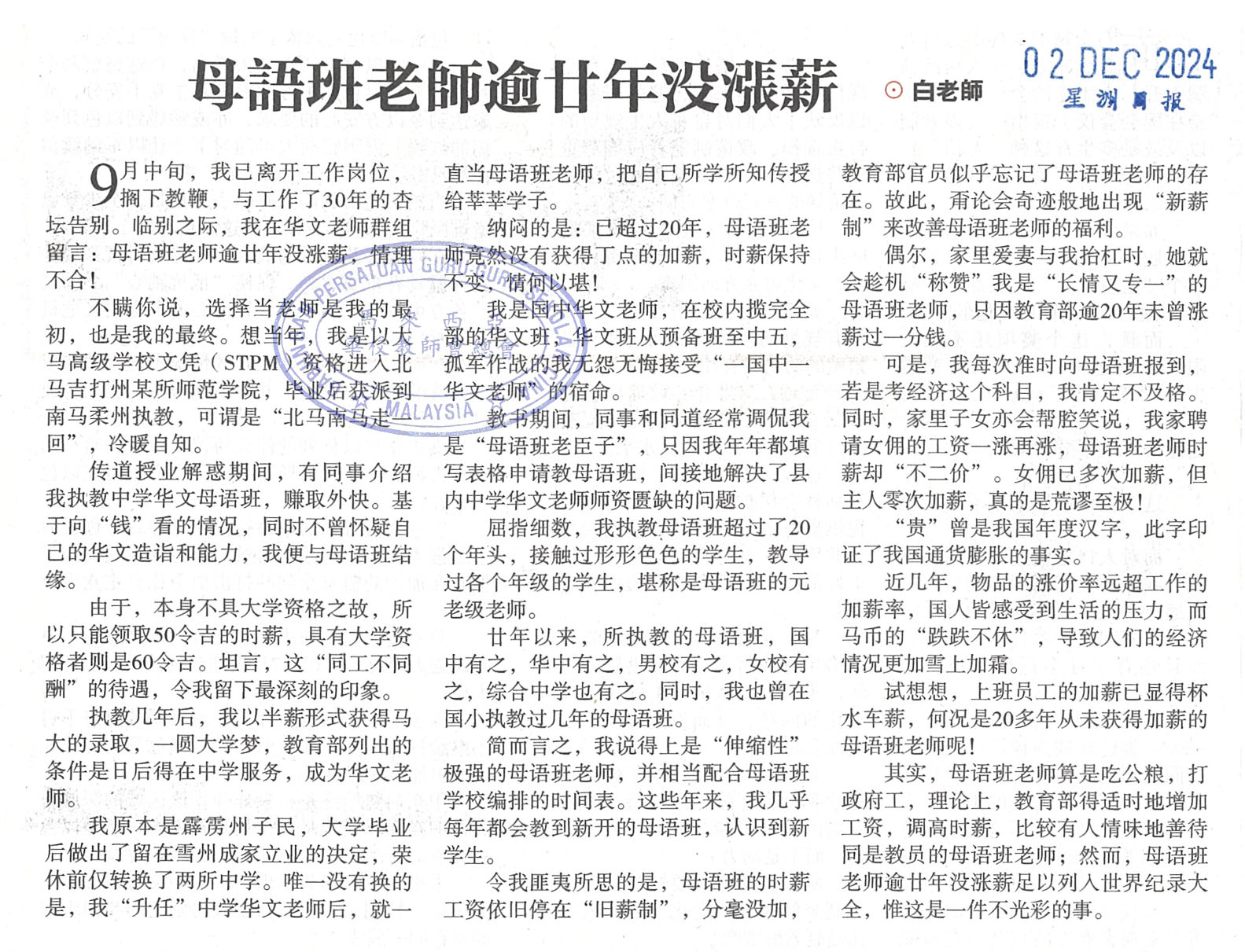 母语班老师逾廿年没涨薪