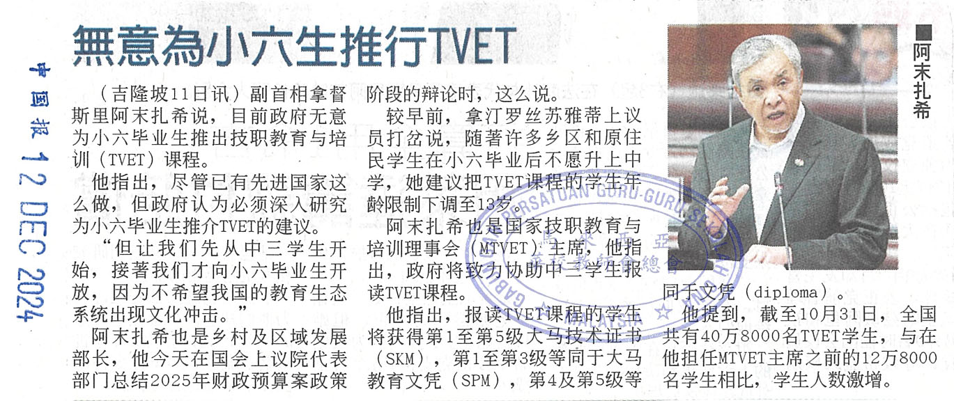无意为小六生推行TVET