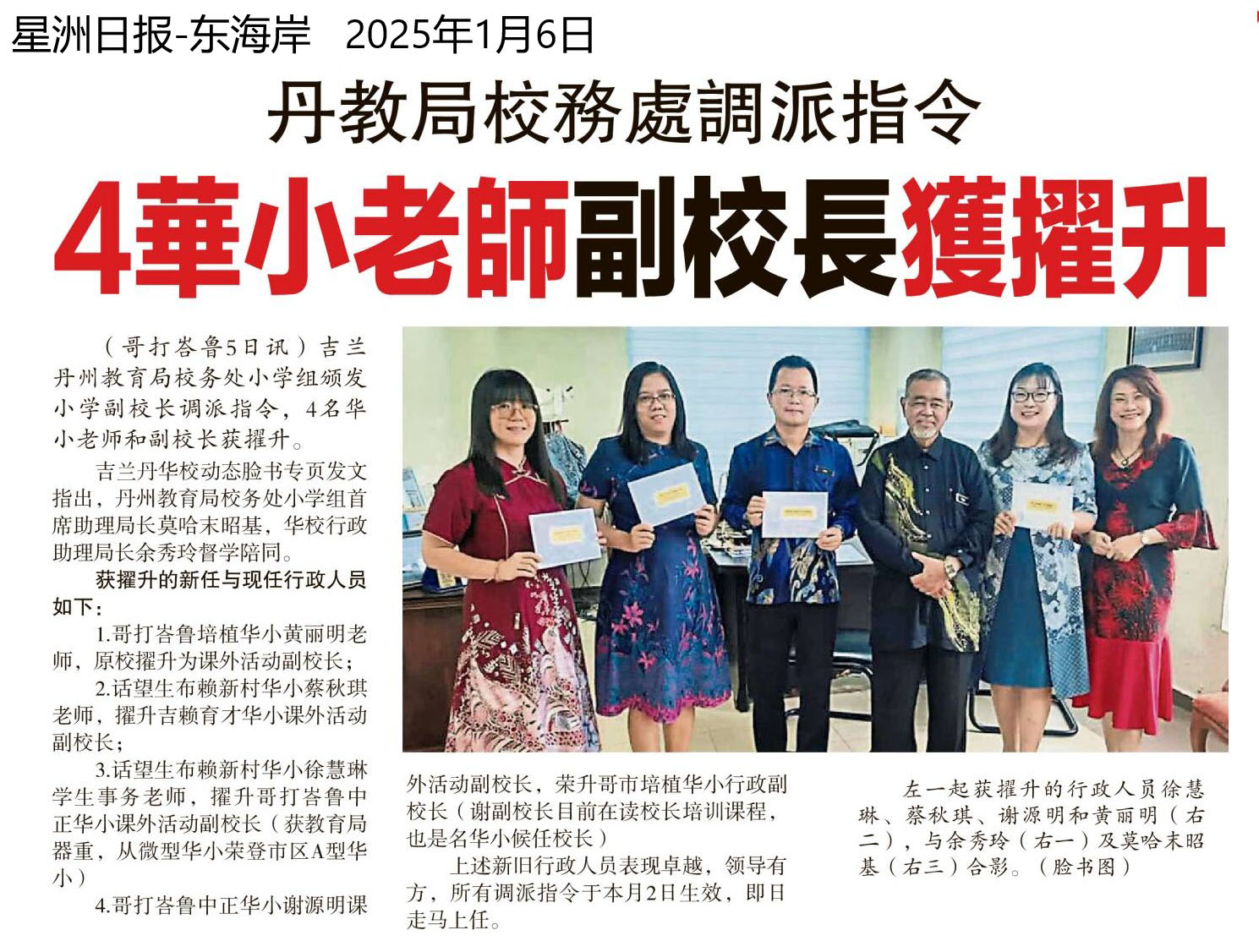 丹教育局校务处调派指令 4华小老师副校长获擢升