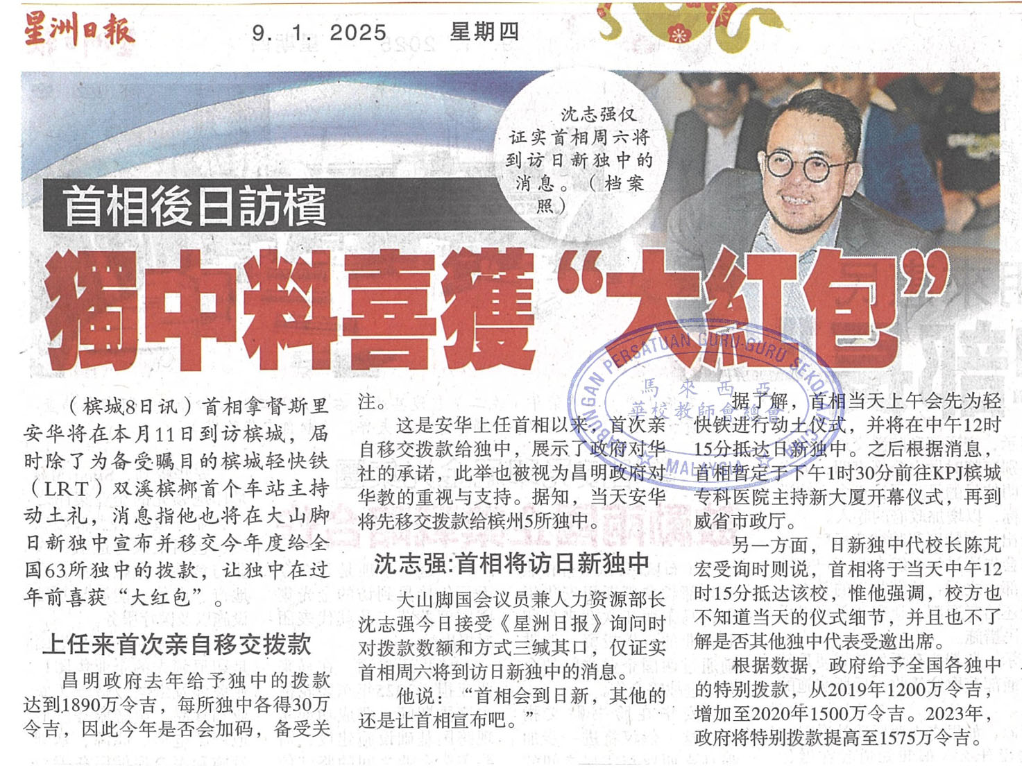 首相后日访槟  独中料喜获“大红包”