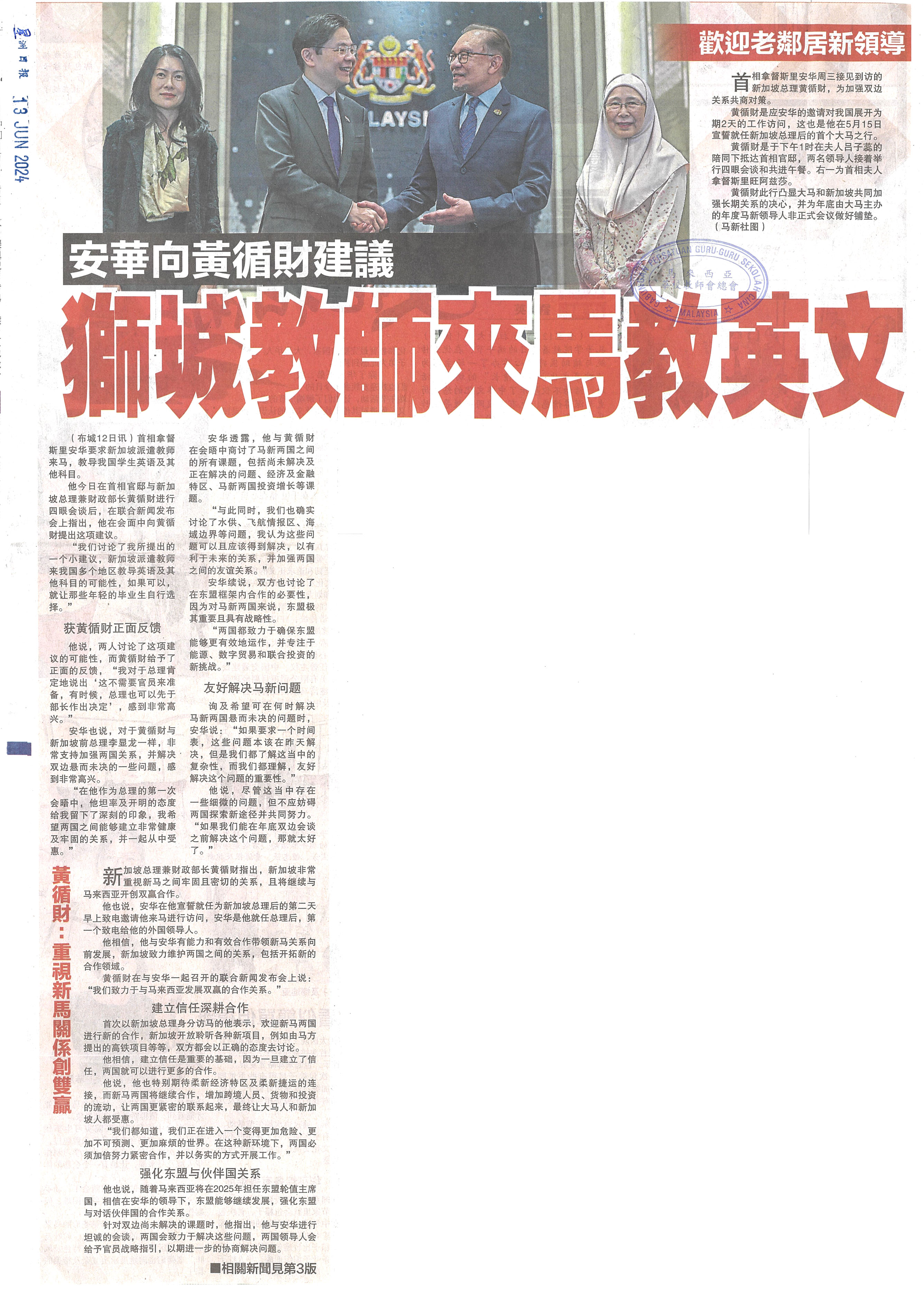 安华向黄循财建议  狮城教师来马教英文