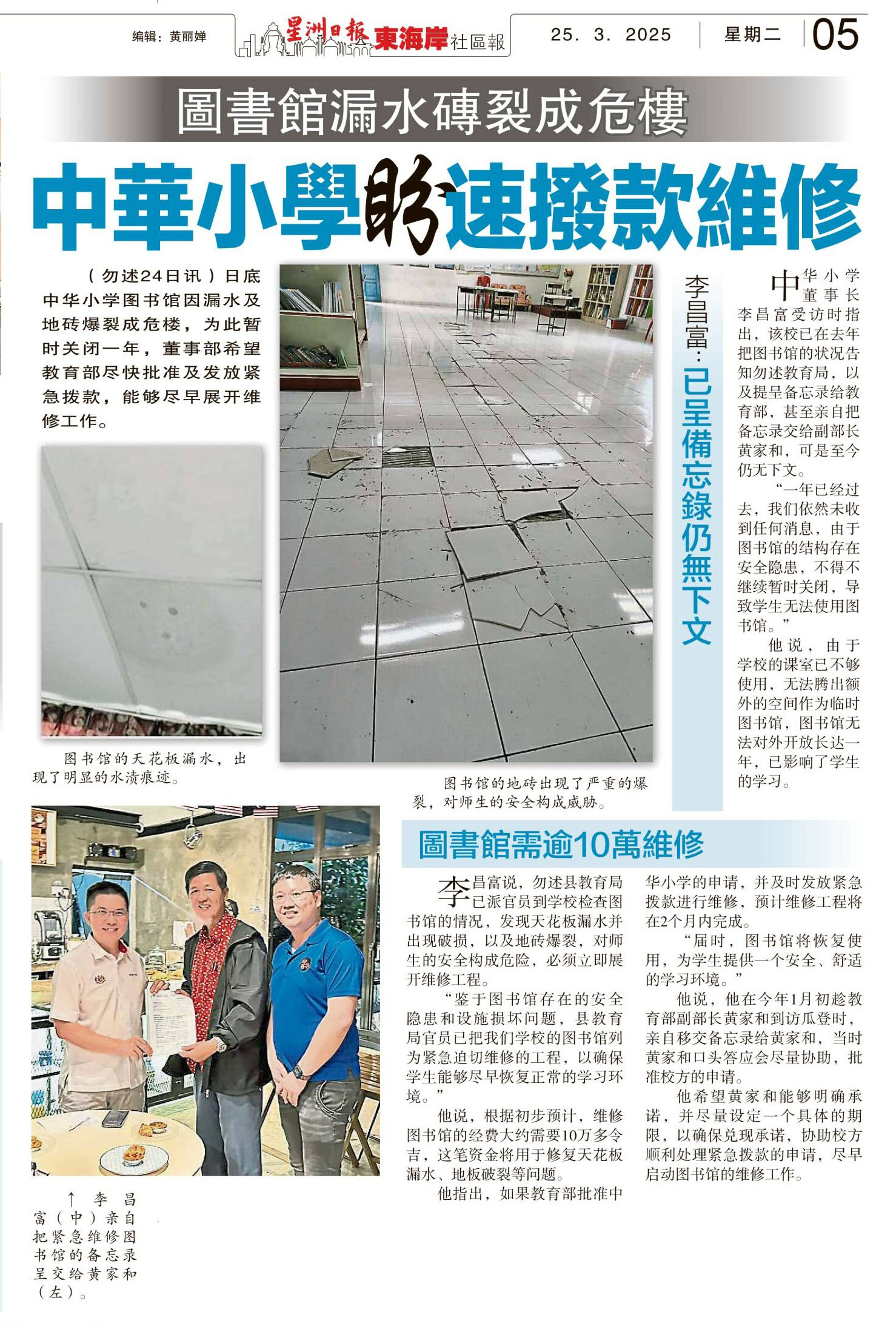 图书馆漏水砖裂成危楼 中华小学盼速拨款维修