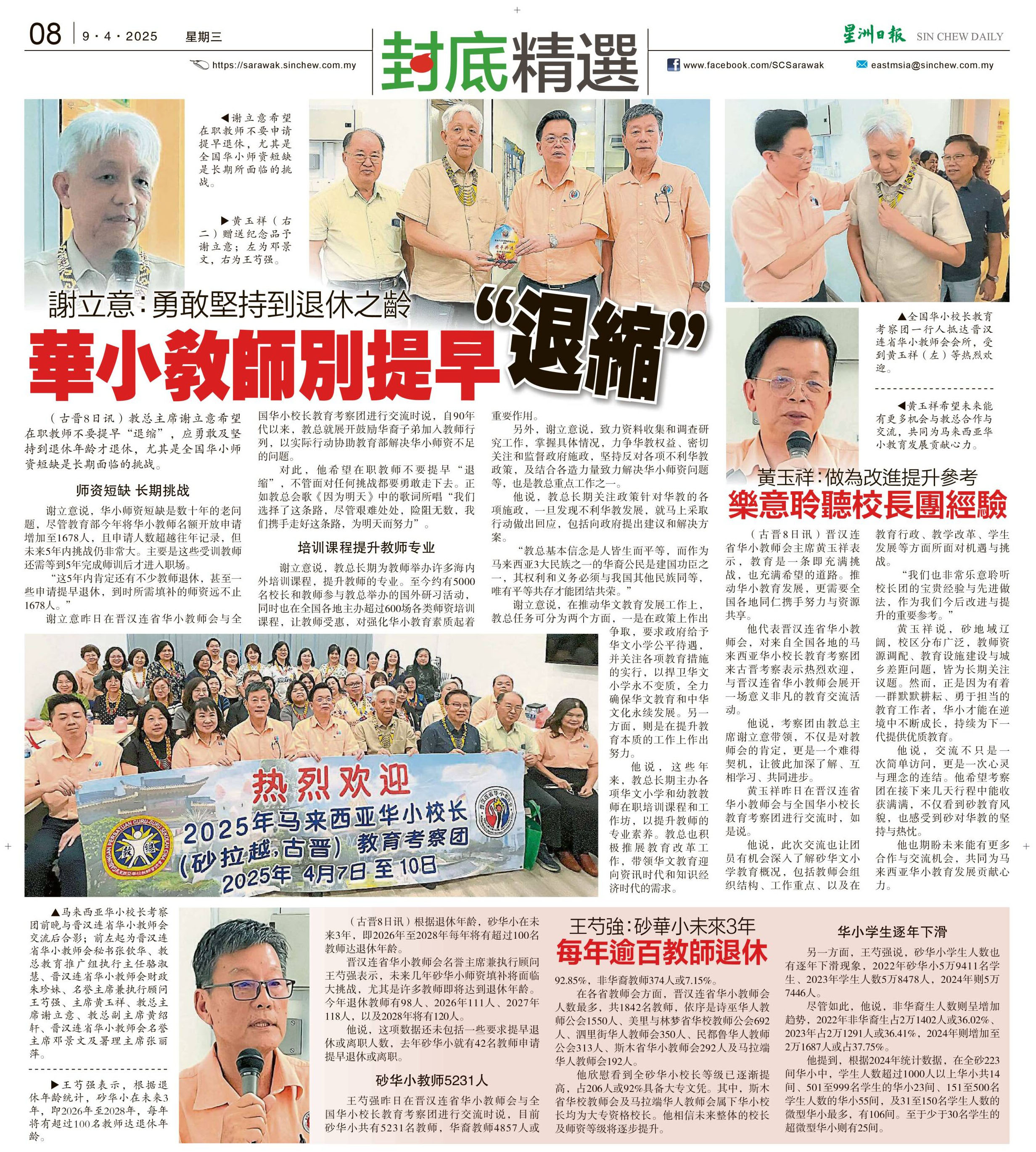 谢立意:勇敢坚持到退休之龄 华小教师别提早“退缩” WhatsApp 上一篇文章: 黄家和:多管齐下培训师资,师范华小组名额增114% 上一页 下一篇文章: 推动公共领域生态系统卓越 峇哥中公膺EKSA认证 下一页