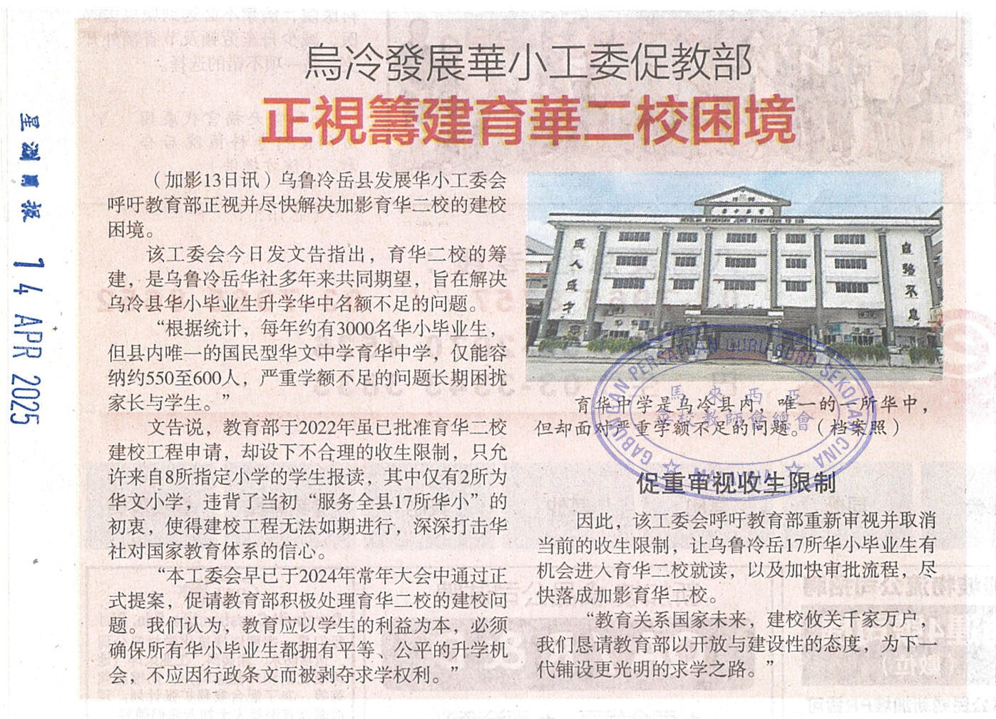 乌冷发展华小工委促教部正视筹建育华二校困境