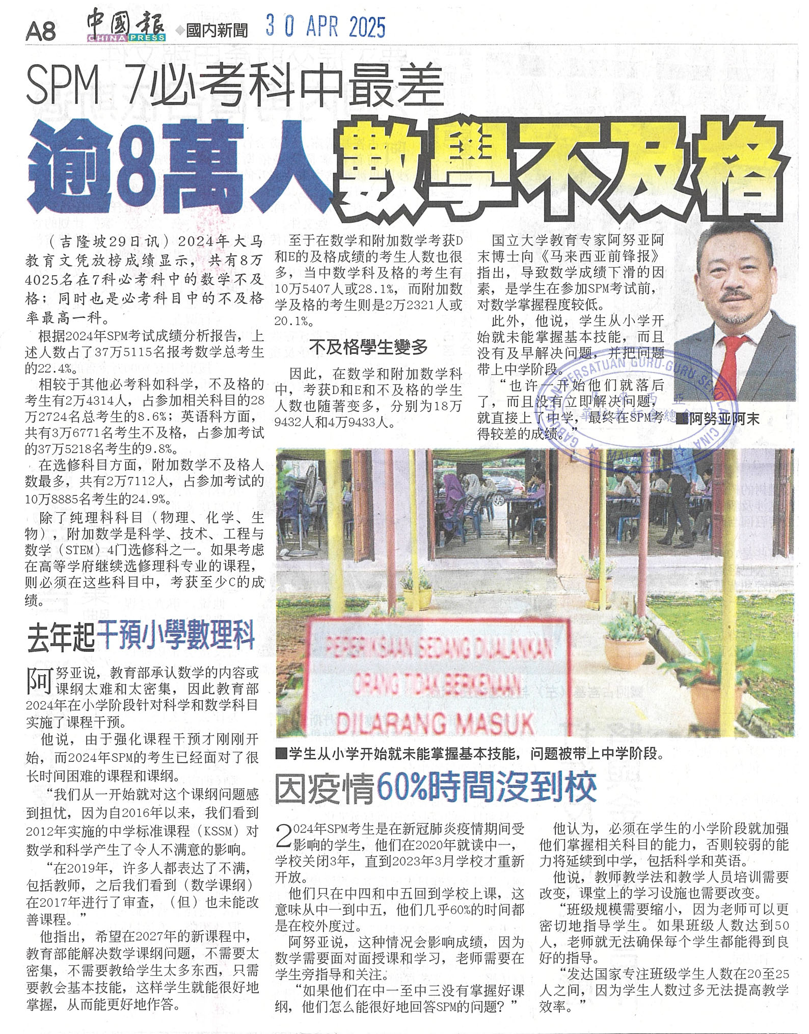 SPM 7必考中最差,逾8万人数学不及格 WhatsApp 上一篇文章: 政府首秘:依纪委会程序采行动,已鉴定涉事官员调查中 上一页 下一篇文章: 甲“郑和小学”新进展,教部与新邦木阁华小商易名 下一页