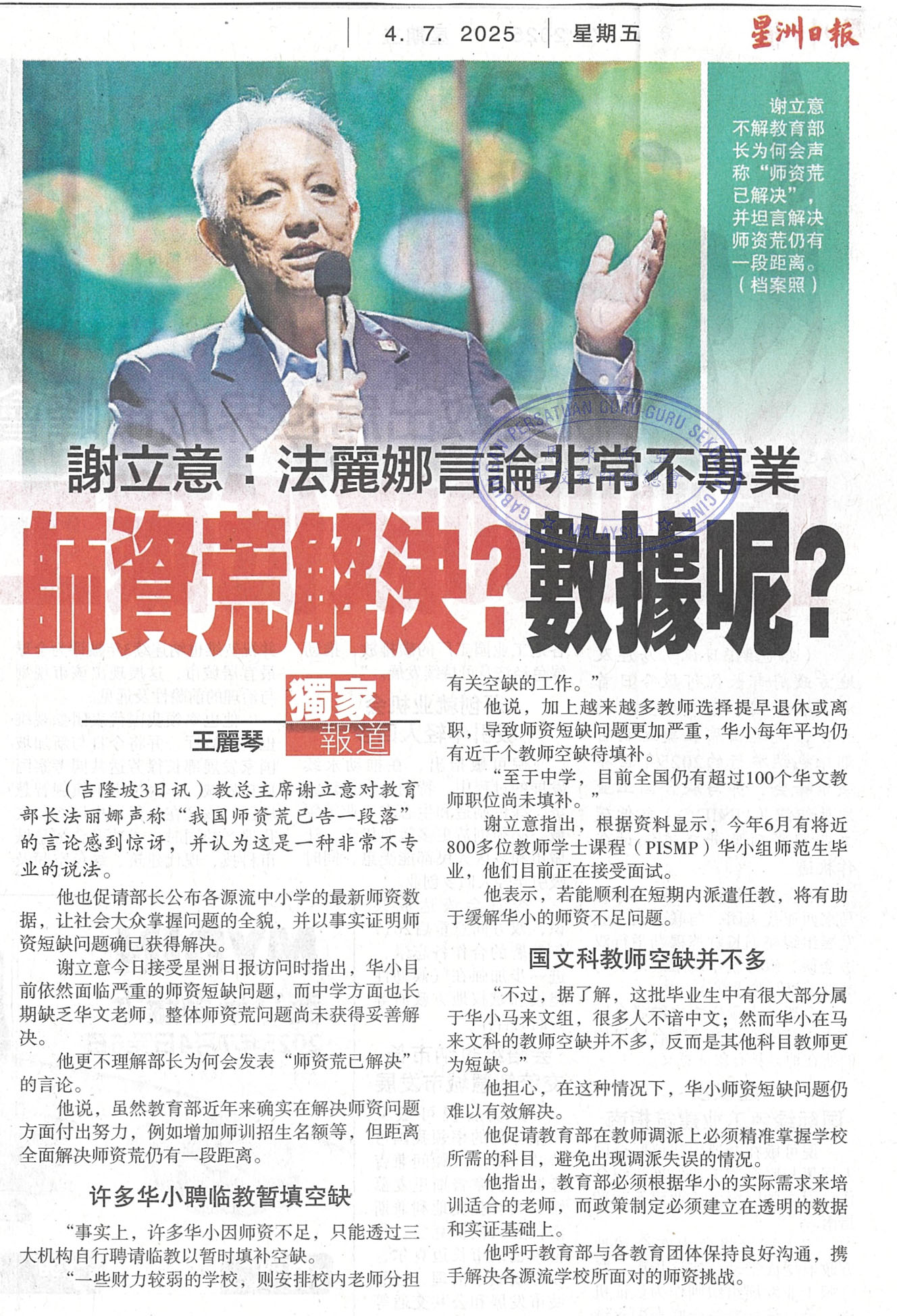 谢立意:法丽娜言论非常不专业,师资荒解决?数据呢? WhatsApp 上一篇文章: 教长:教育史上重大突破“师资荒告一段落” 上一页 下一篇文章: 益民学前班只欠东风 未获批文董事认领孩童就读私幼 下一页