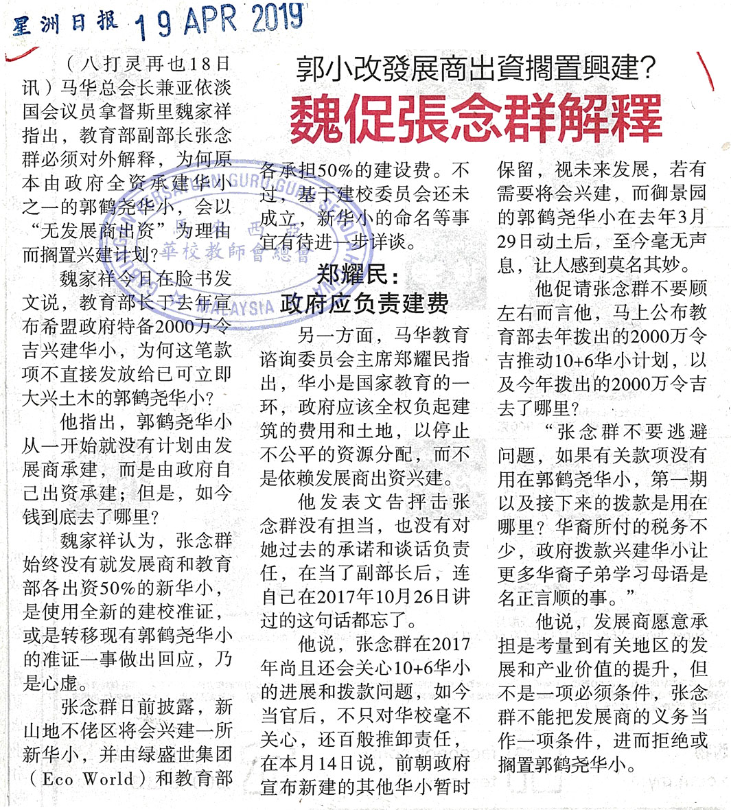 郭小改发展商出资搁置兴建? 魏促张念群解释 WhatsApp 上一篇文章: “3 in 1” Plan To Boost Unity in Schools 上一页 下一篇文章: 关中报考统考新闻 下一页