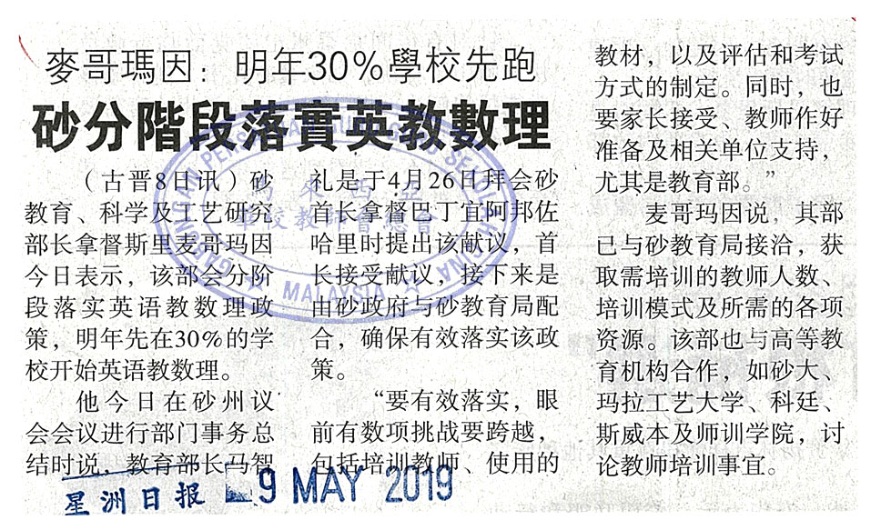 麦哥玛因:明年30%学校先跑 砂分阶段落实英教数理