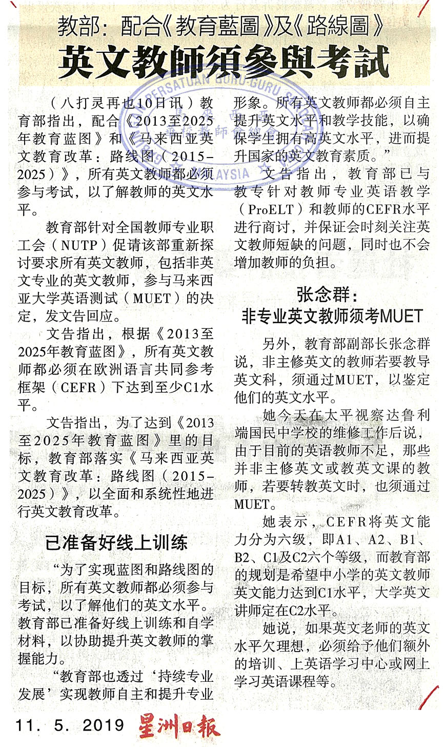 教育部:配合《教育蓝图》及《路线图》 英文教师须参与考试 WhatsApp 上一篇文章: 考试局:新格式经仔细研究 PT3华文考2小时足够 上一页 下一篇文章: 张念群:5000万特别拨款 等待学校来申请 下一页